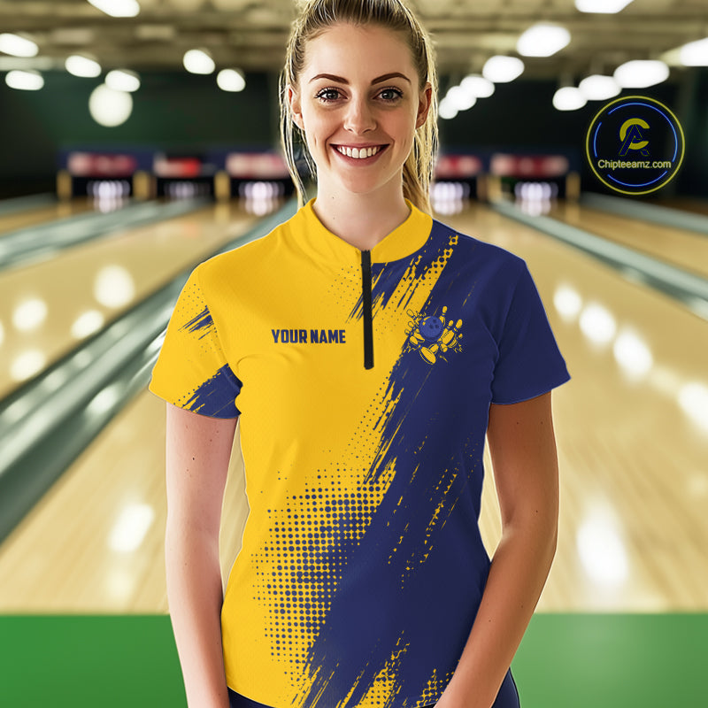 Custom Blue and Yellow Strike Bowling Shirts Women Polo, 1/4 Zip Bowling Team Jerseys Bowling League NQS11039