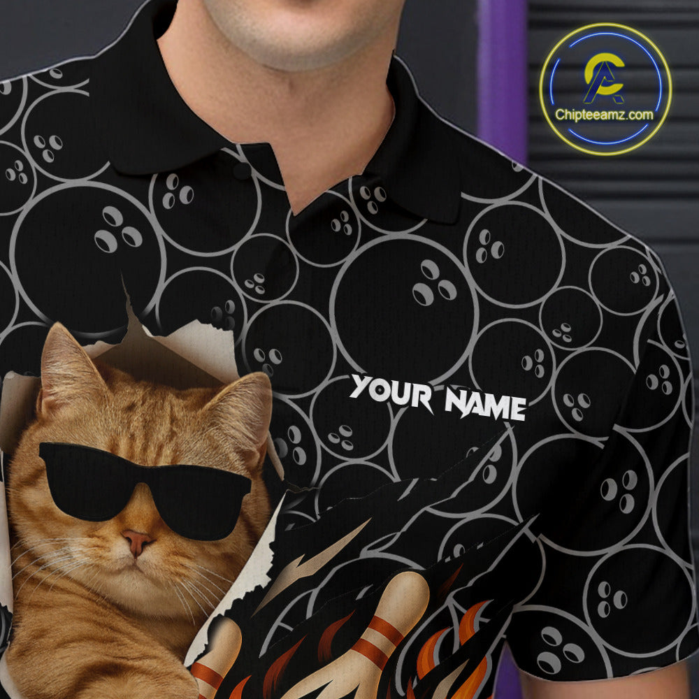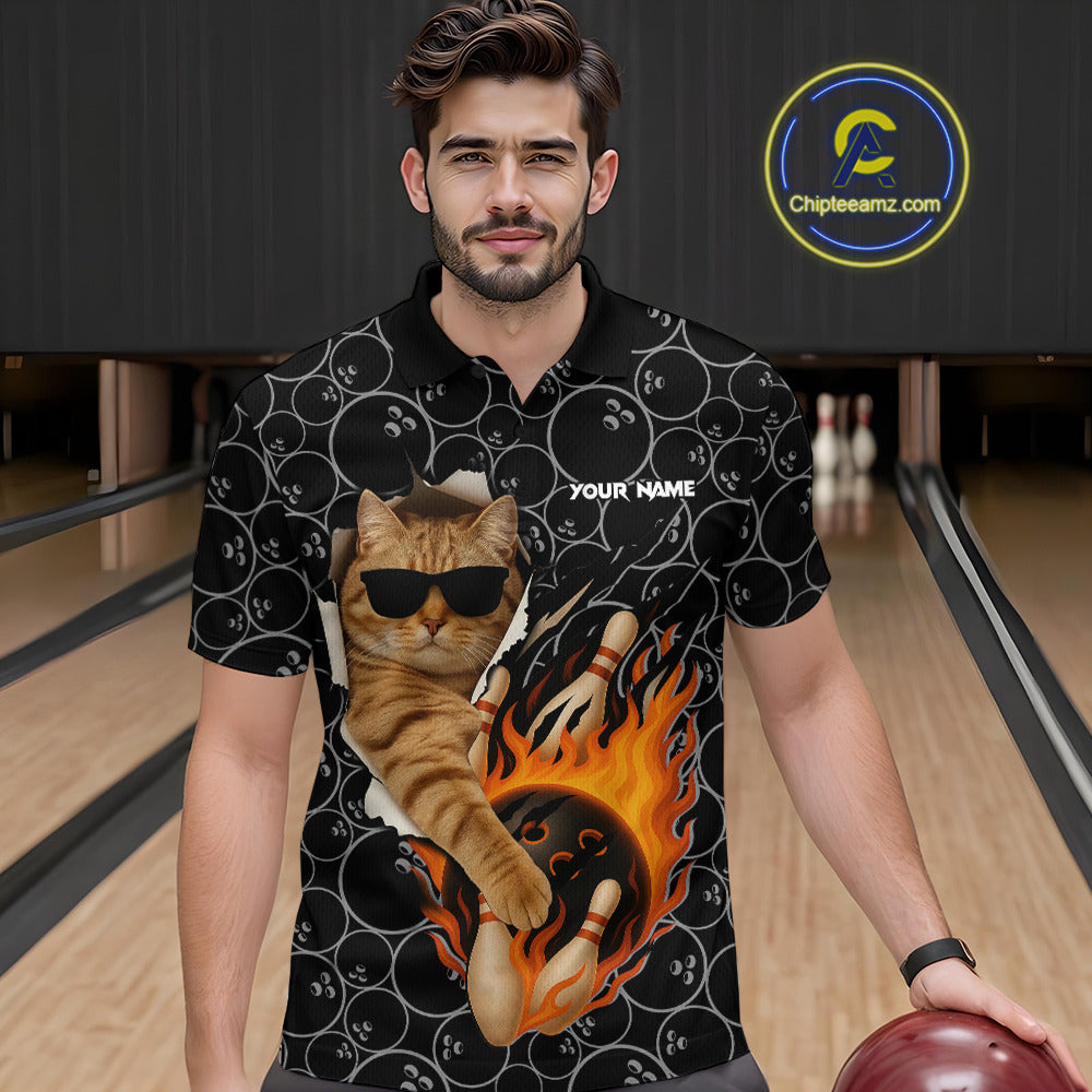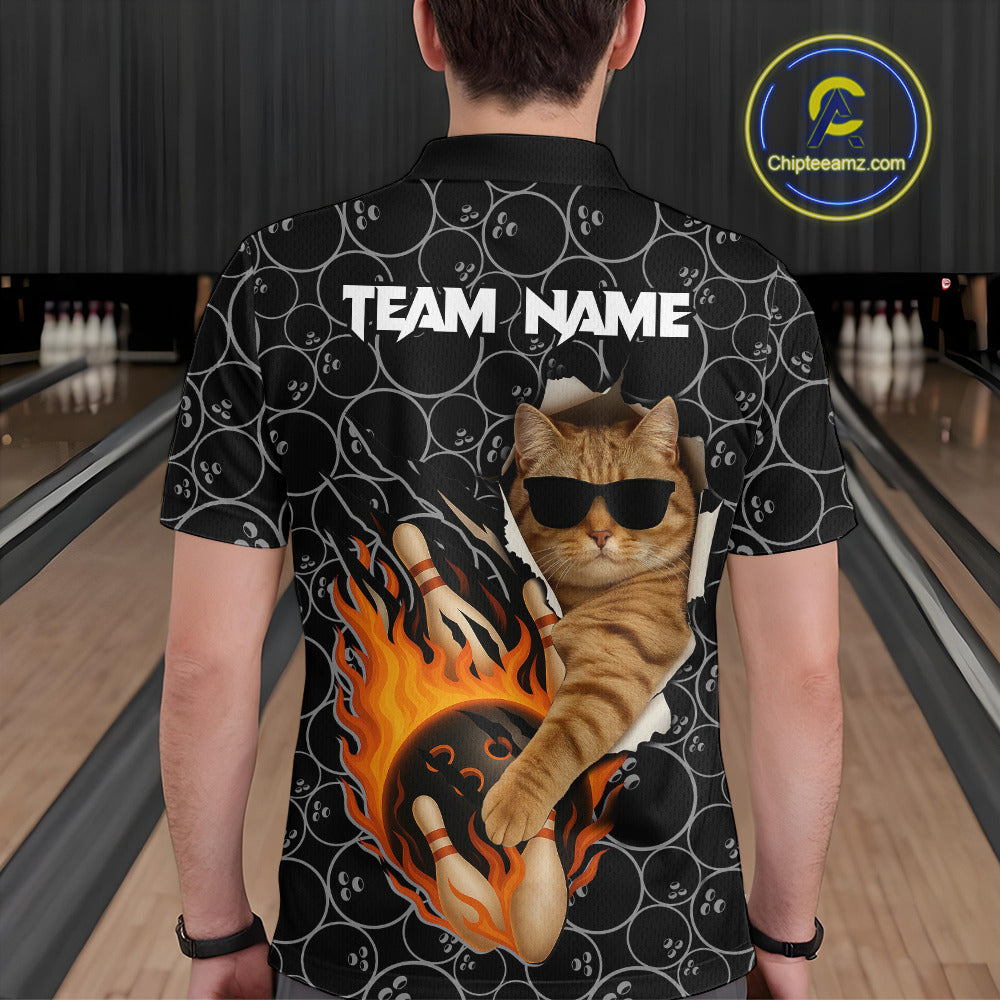 Custom Funny Cat Bowling shirts for men, black camo flame cool bowling uniform for team bowlers NQS11074