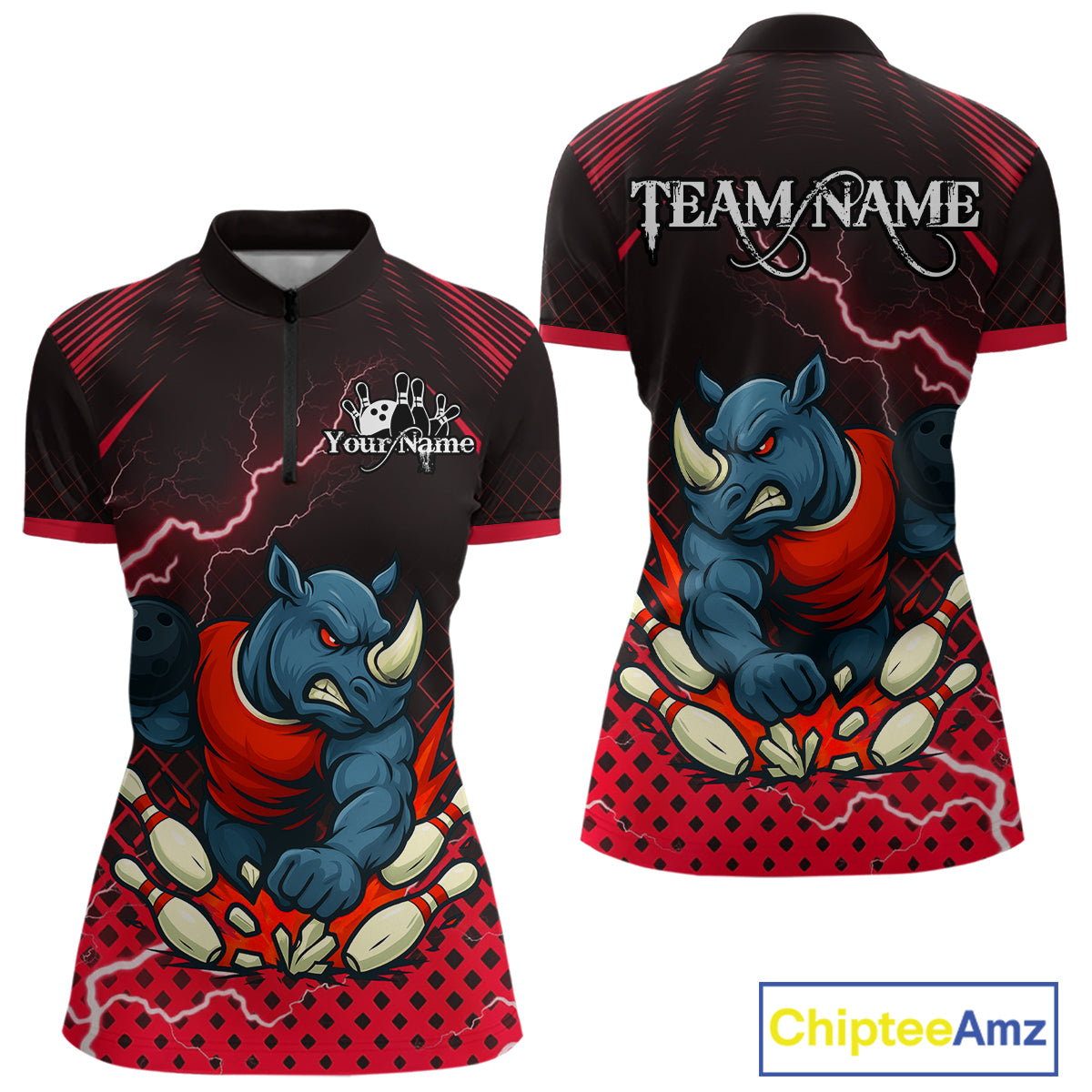 Custom Funny Red Rhino Bowling Team Shirt for Women Bowling Jersey Polo, Quarter-Zip Outfit QZT805