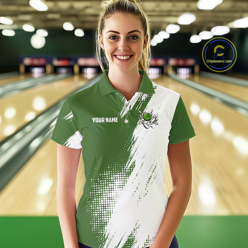 Custom Green and White Strike Bowling Shirts Women Polo, 1/4 Zip Bowling Team Jerseys Bowling League NQS11037