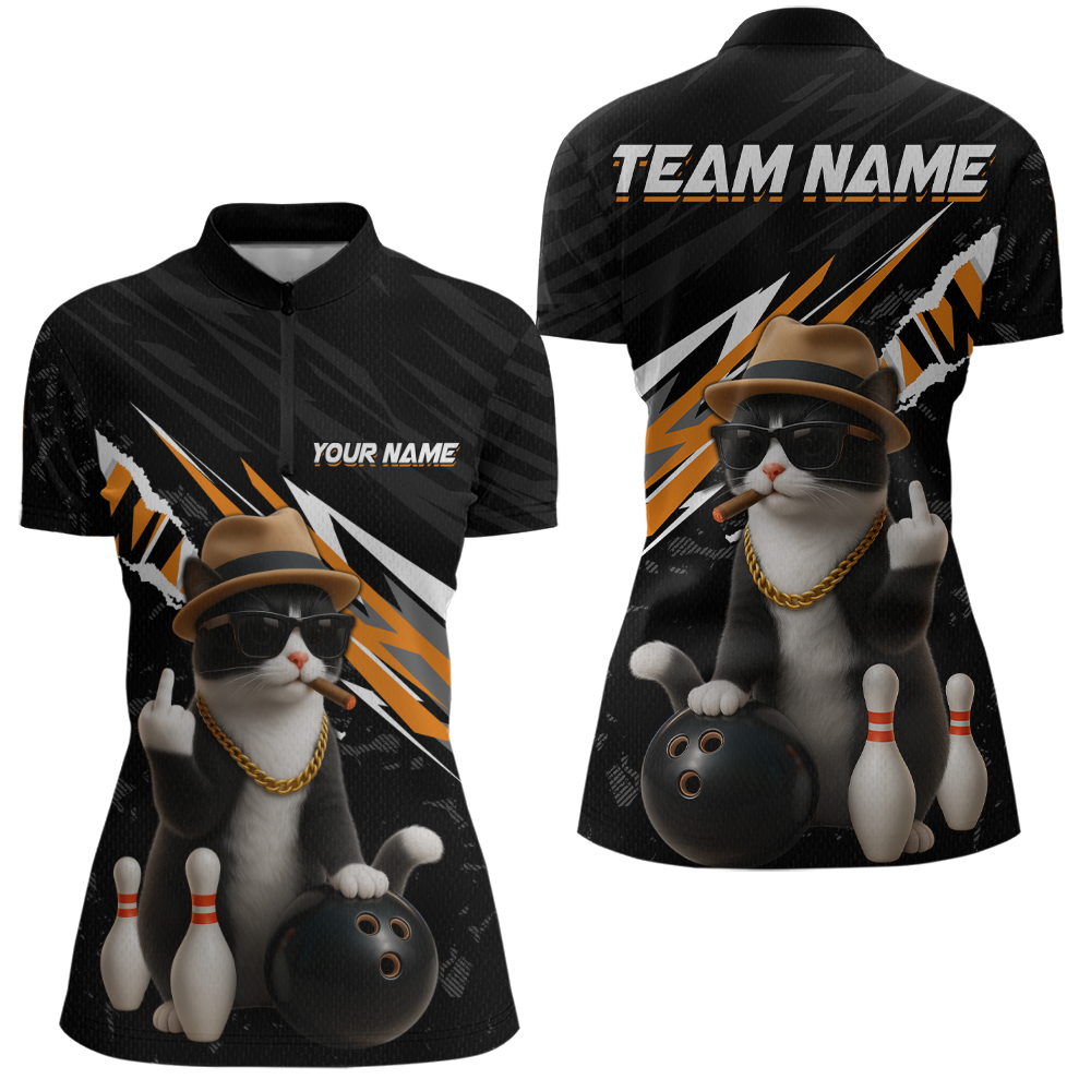 Custom Orange Funny Cat Bowling Jersey for Women Bowling Shirt Polo & 1/4 Zip Bowling Team Shirts HNT136