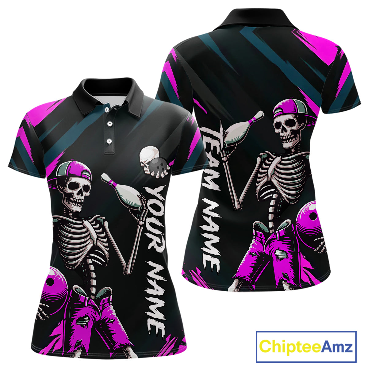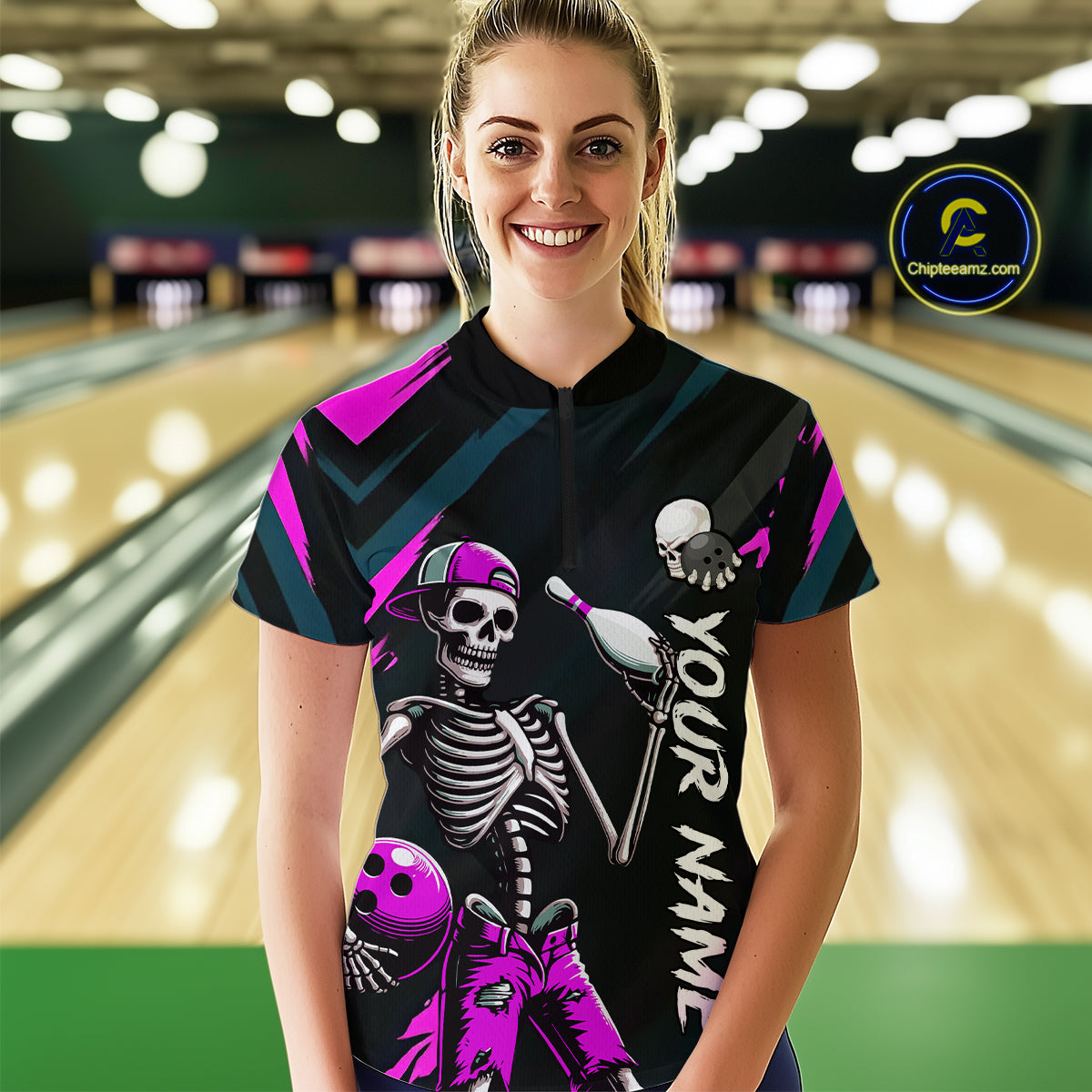 Custom Pink Skull Bowling Team Shirt for Women Polo & 1/4 Zip Bowling League Jersey Bowling Gift QZT794