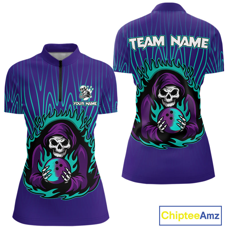 Custom Purple and Blue Flame Skull Reaper Bowling Shirts For Women, Personalized Team Bowling outfits NQS11030