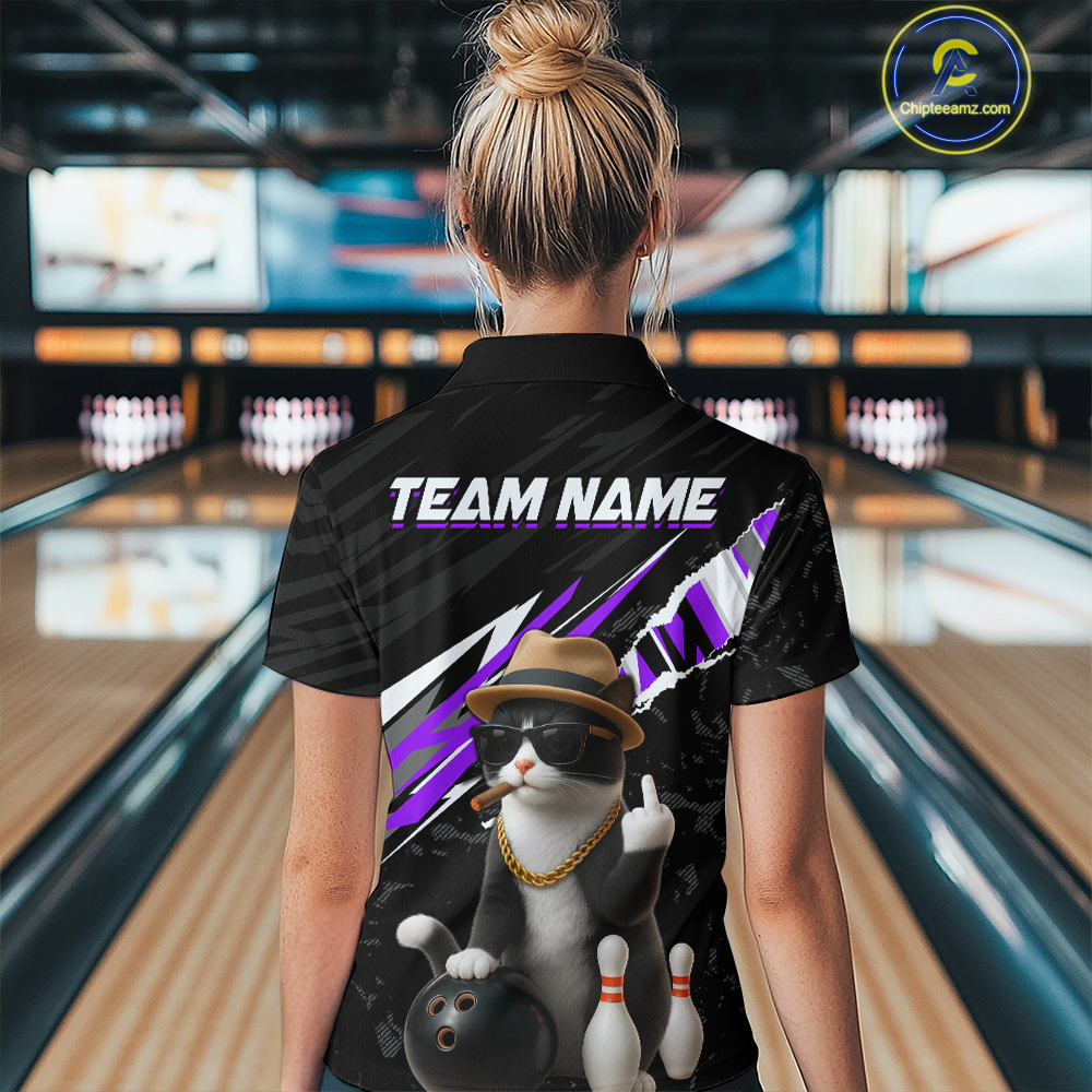 Custom Purple Funny Cat Bowling Jersey for Women Bowling Shirt Polo & 1/4 Zip Bowling Team Shirts HNT136