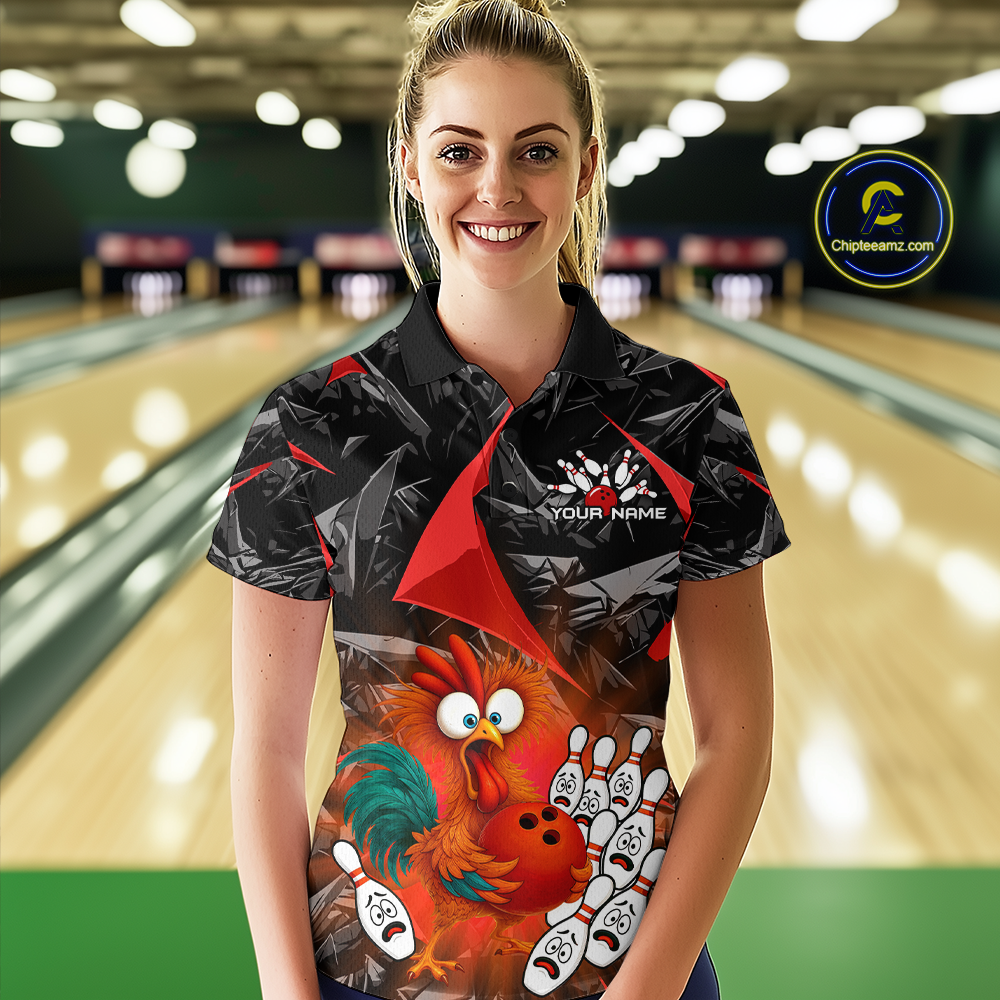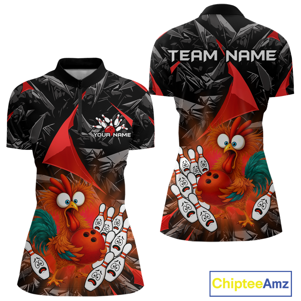 Custom Red Funny Chicken Bowling Jersey for Women Bowling Team Shirts Polo & 1/4 Zip HNT138