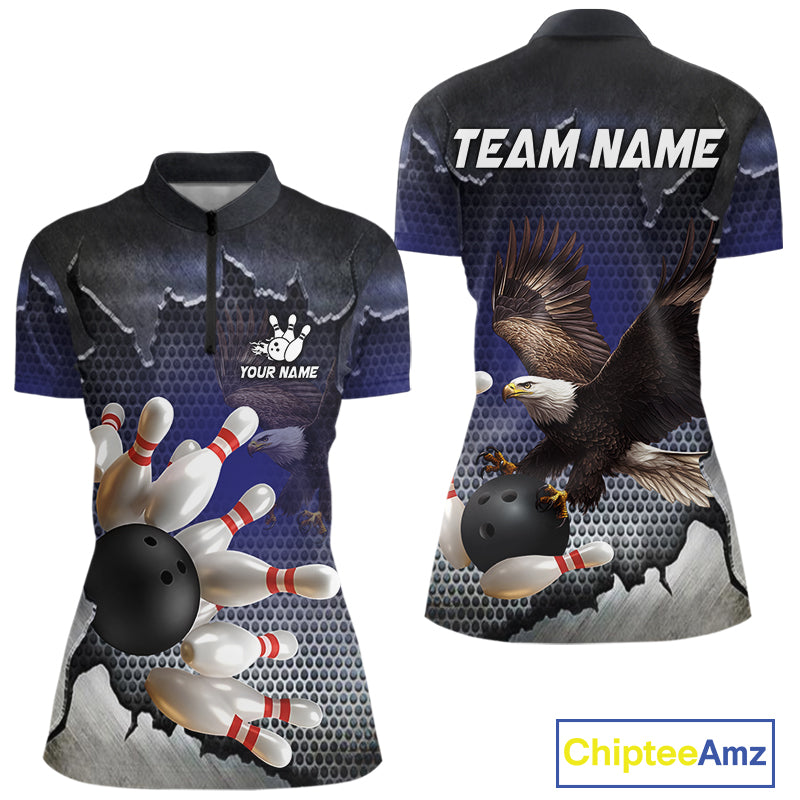 Eagle Bowling Polo, Quarter Zip Shirts for Women Custom Team Bowling jerseys, gift for bowlers | Blue NQS10972