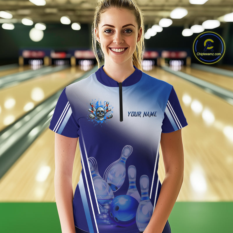 Personalized Blue Gradient Skull Bowling Shirts For Women Custom Bowling Team Jerseys Gift For Bowler NQS11138