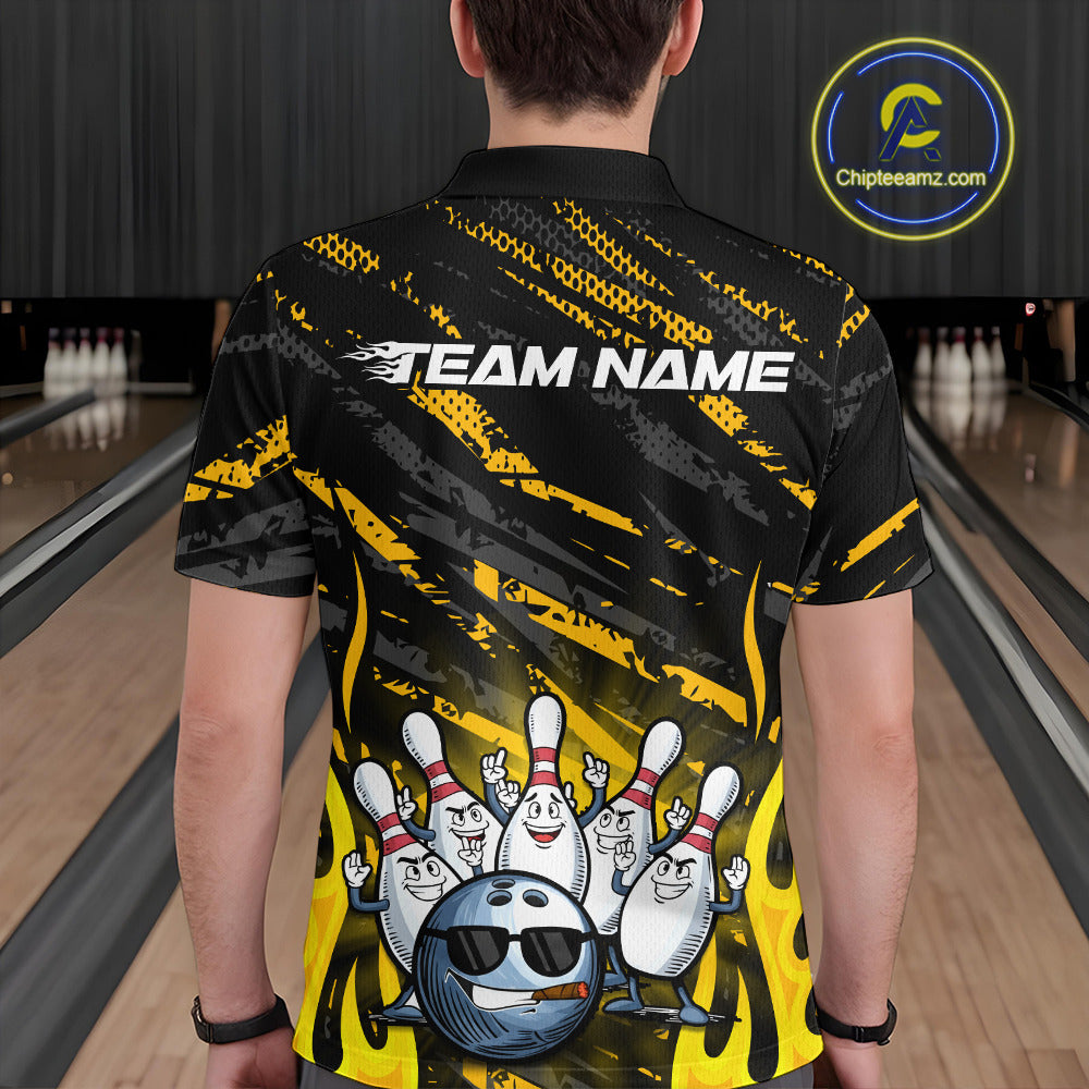 Custom Yellow Camo Funny Flame Bowling Men Polo Shirts, Bowling Team League Shirt IPHW10090
