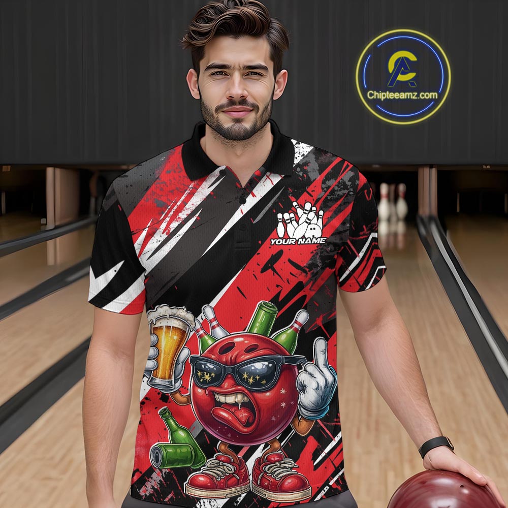 Custom Funny Bowling Ball Drink Beer Bowling Men Polo Shirt, Grunge Red Team Shirt IPHW10117