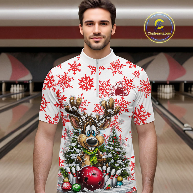 Custom Cute Funny Reindeer Christmas Bowling Men Quarter-Zip Shirts, Xmas Team Bowling Shirt IPHW10113
