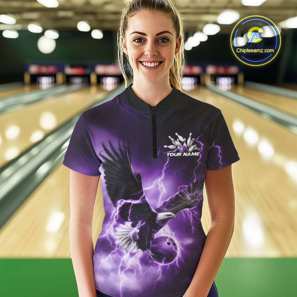 Custom Purple Thunder Lightning Eagle Women Bowling Shirts, Eagle Bowling Team Jerseys IPHW10148