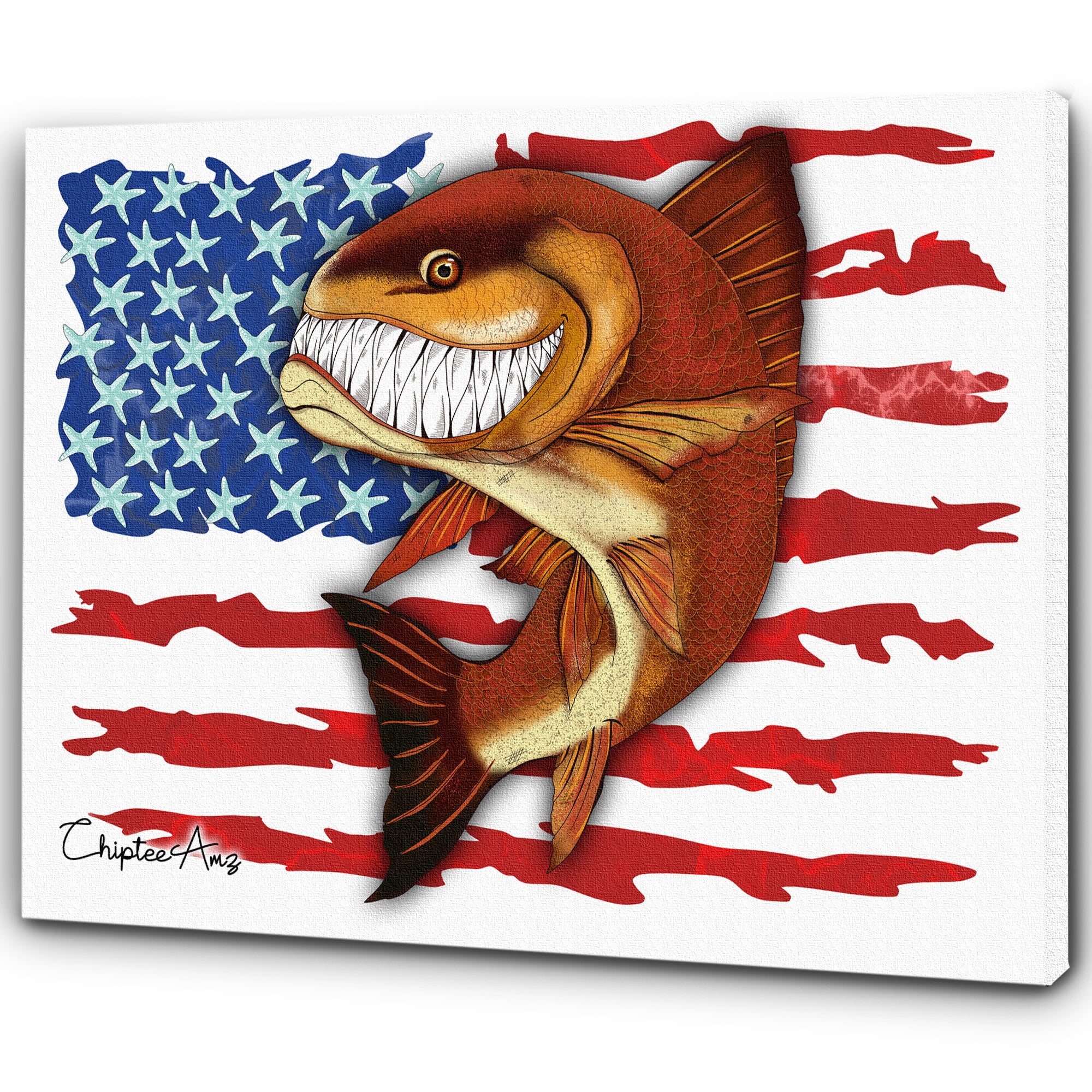 Redfish fishing art with American flag ChipteeAmz's fish art canvas AT006