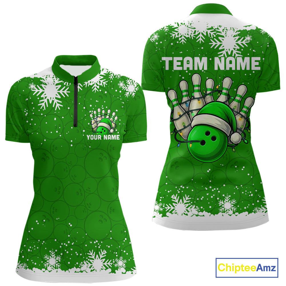 Green Christmas Bowling snowflake Women's Bowling Polo, Quarter Zip shirt Custom Xmas Bowling Outfits NQS10996