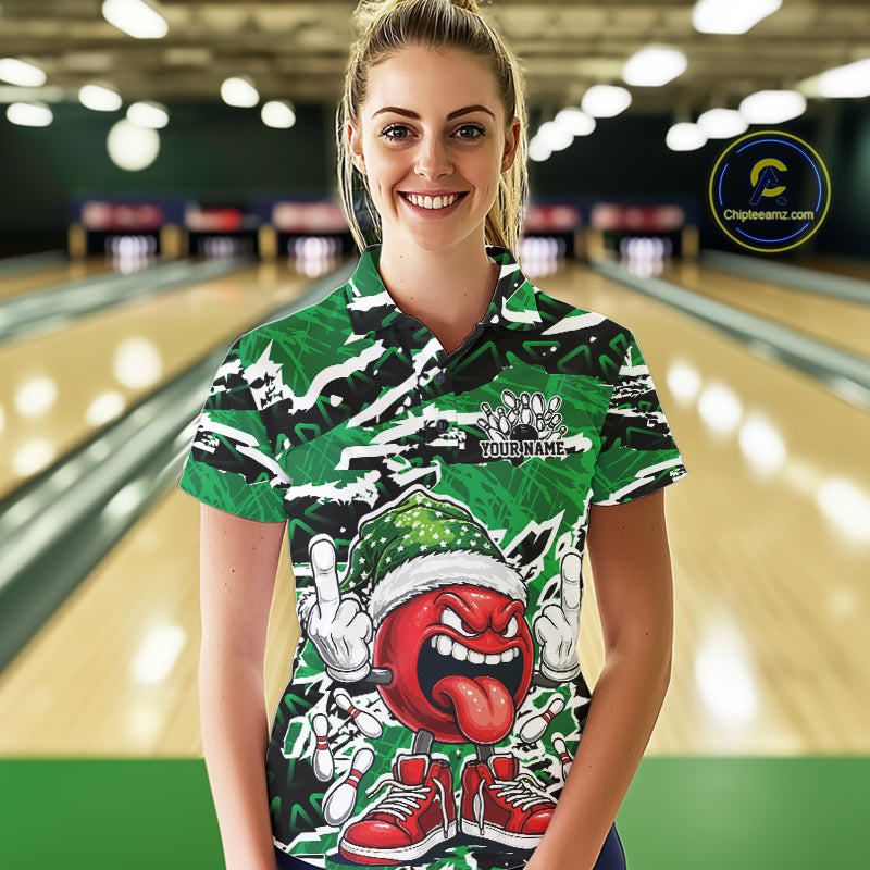 Custom Funny Christmas Bowling Women Polo Shirts, Crazy Bowling Ball Xmas Outfit IPHW10132