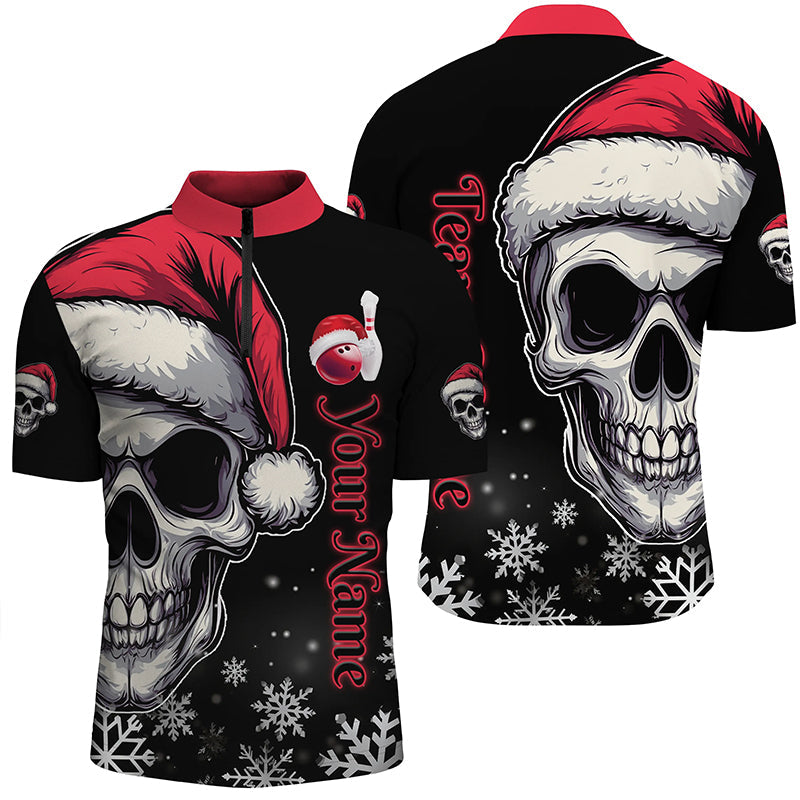 Red and Black Christmas Skull Mens Bowling Polo, Quarter Zip shirts custom Xmas Team bowling jerseys NQS8837