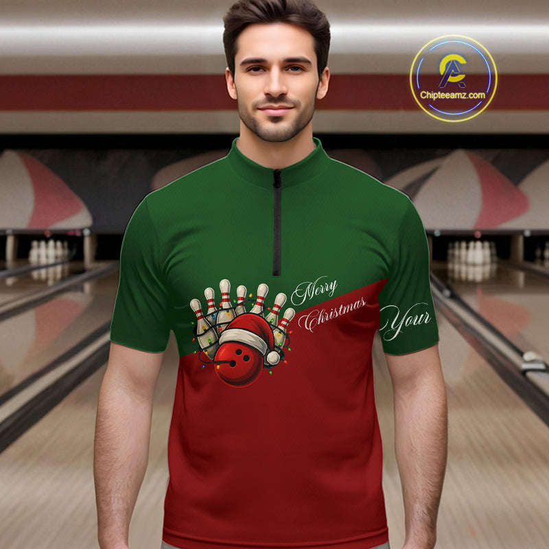 Red and Green Christmas Bowling Polo, Quarter Zip Shirts For Men custom mens bowling jerseys NQS11052