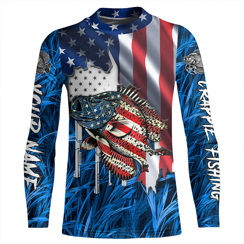 American flag patriot Crappie blue camo fishing, custom mens long sleeve sun protection fishing shirts NQS7987