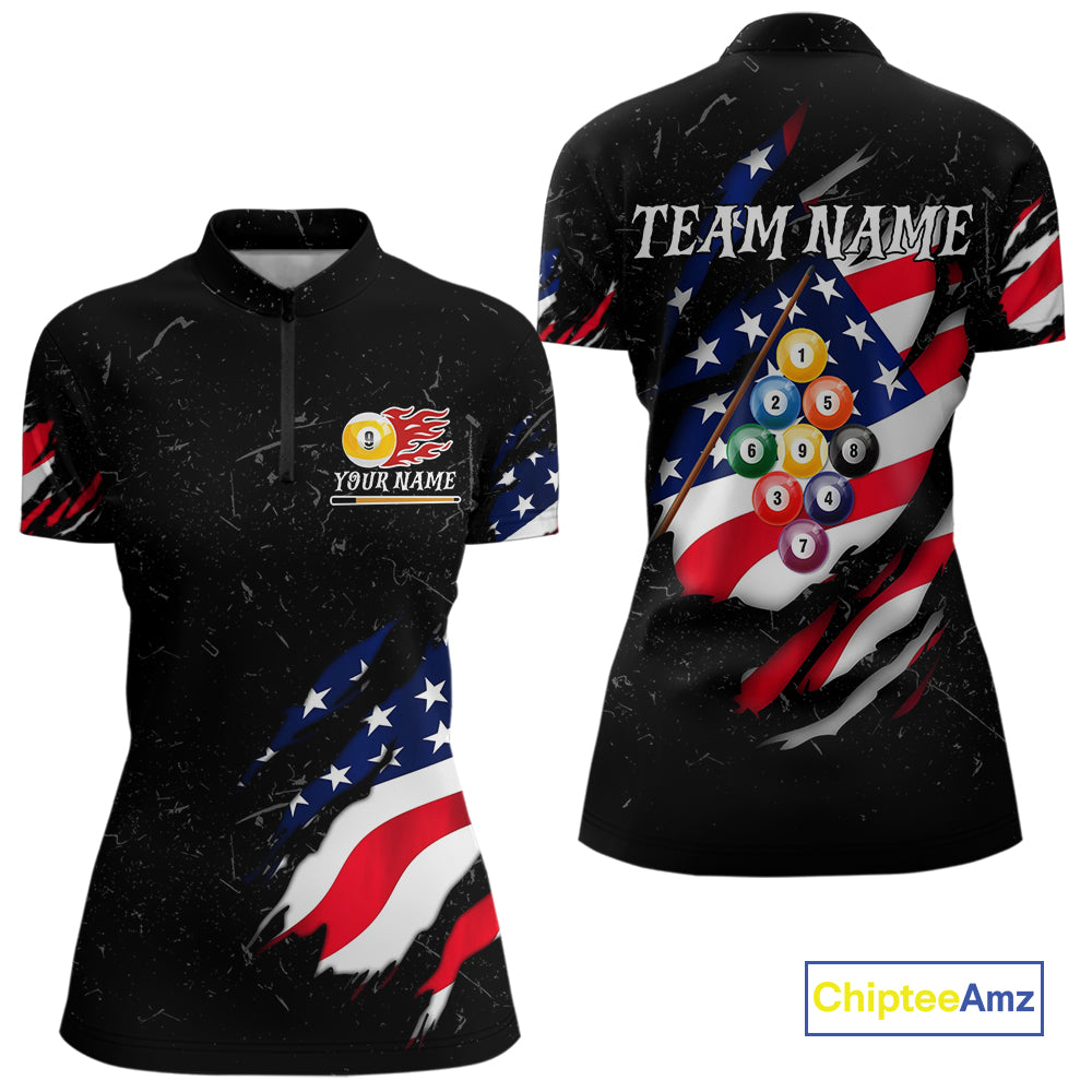 Personalized Patriotic 9 Ball Billiard Shirt For Women Custom Black Grunge American Flag Pool Jersey TDM4758
