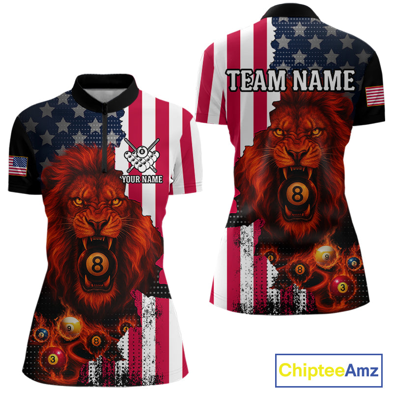 American Flag Lion 8 Ball Billiard Shirt For Women Custom Patriotic Pool Team Shirt Polo & 1/4 Zip TDM5341
