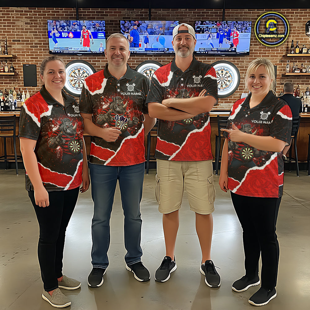 Black & Red Splatter Rhino Men Darts Polo Shirt Custom Funny Team Dart League Jerseys NYN2067