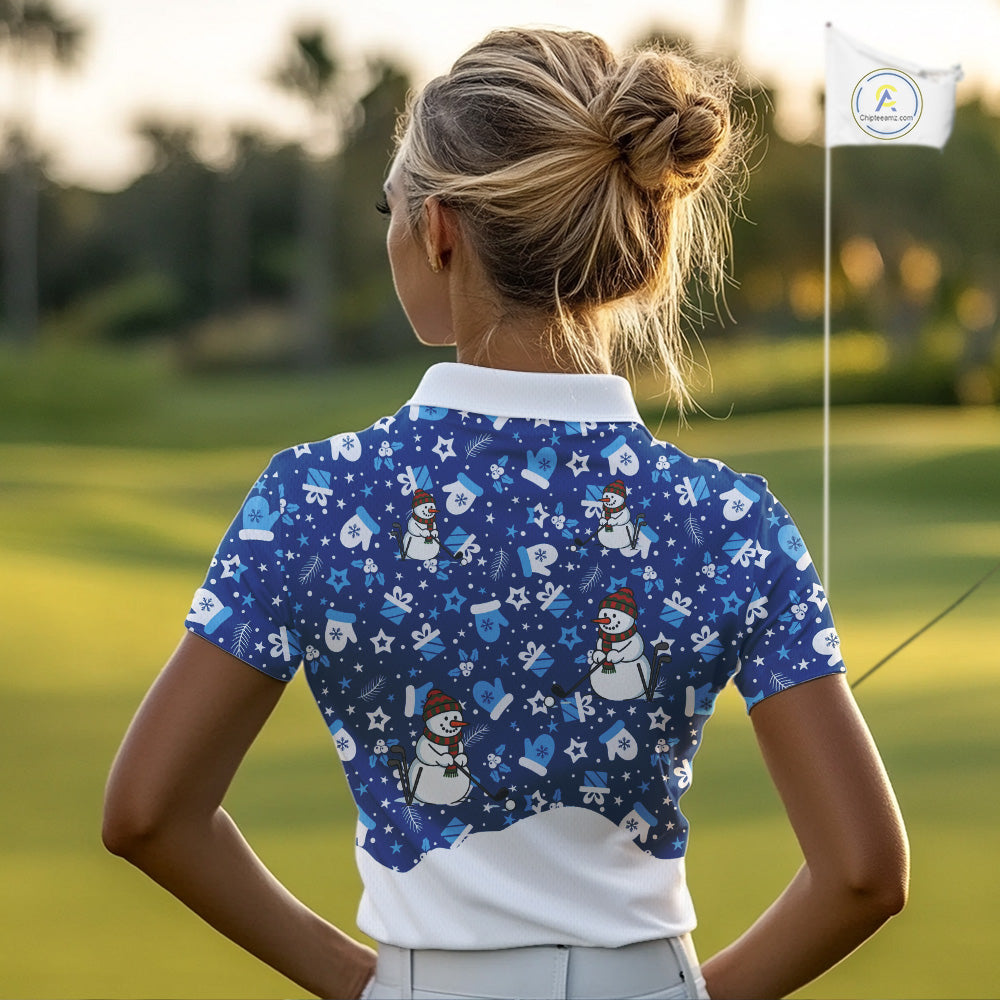 Blue and White Snowman Christmas pattern Golf Polo shirt For women Custom ladies Christmas golf shirt NQS11004