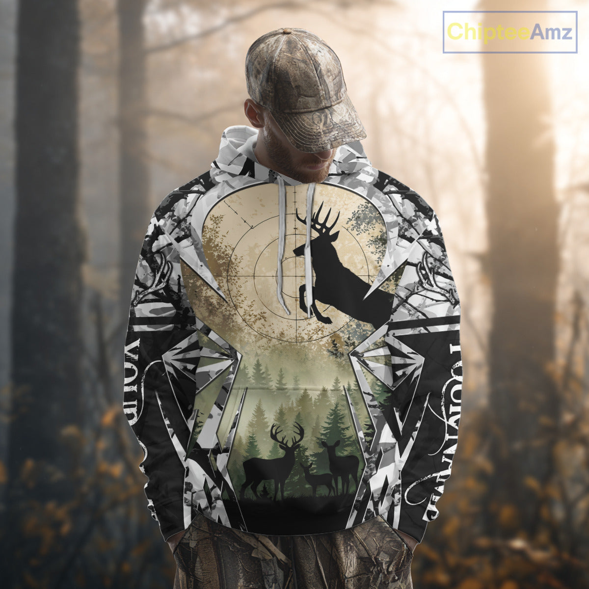 Grey Camo Deer Hunting Hoodie, Buck with Scope Silhouette, Whitetail Season NBT14