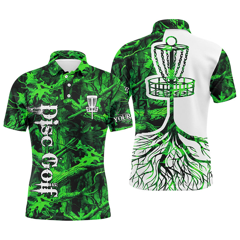 Mens disc golf polo shirt custom name green camo disc golf basket, personalized disc golf shirts NQS5034