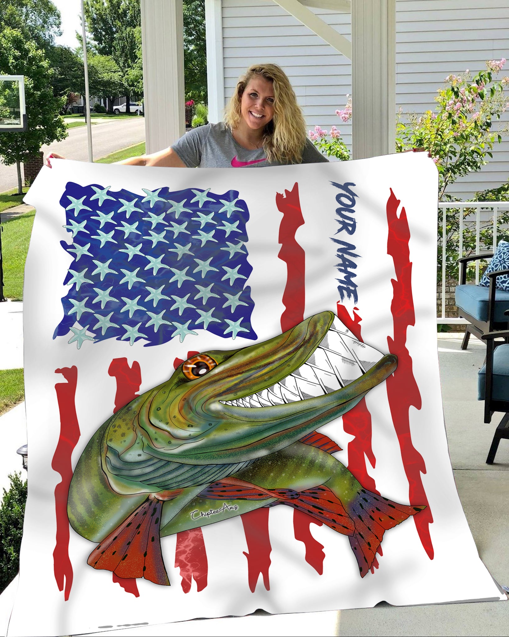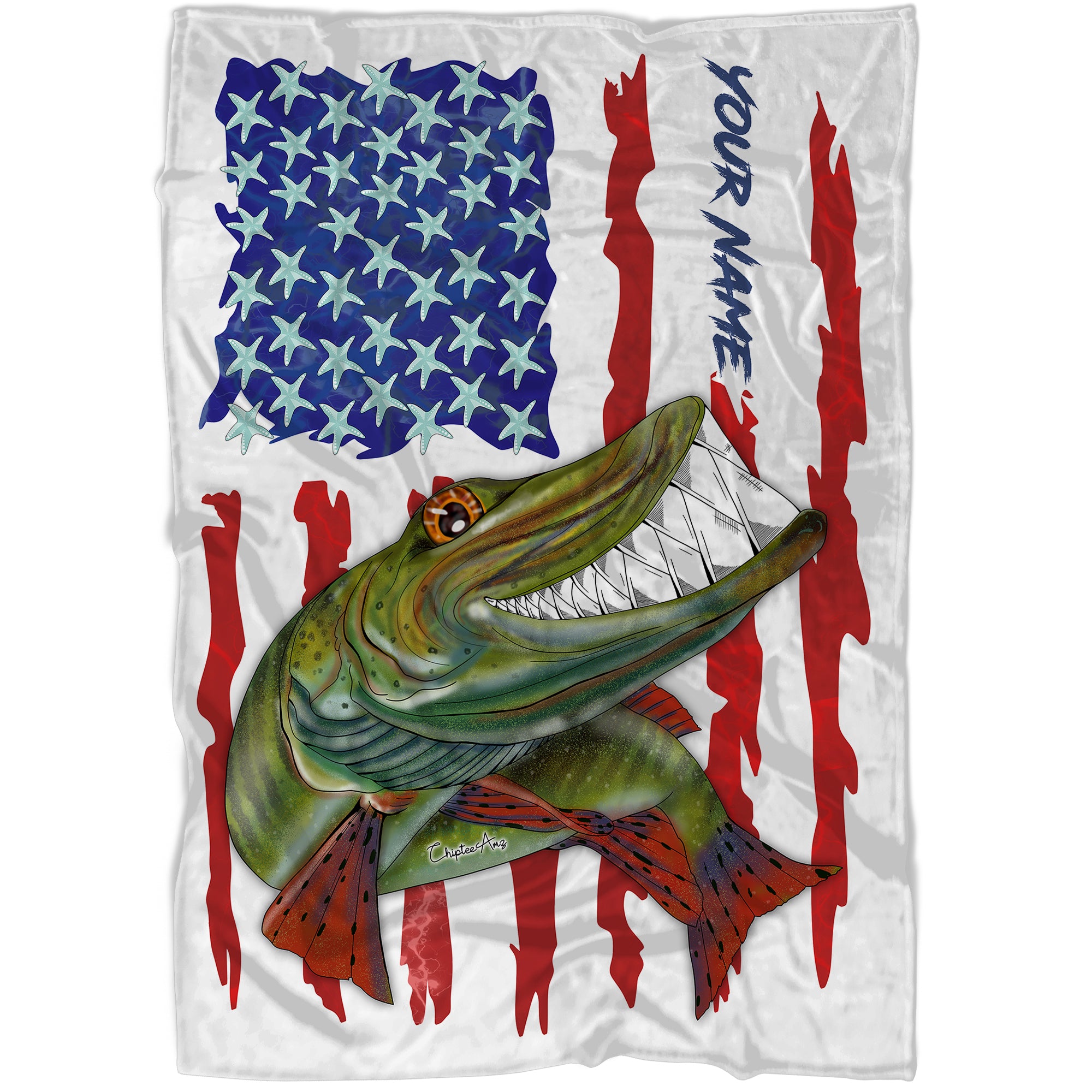 Muskellunge fishing American flag funny Musky ChipteeAmz's art custom name fishing fleece blanket AT052