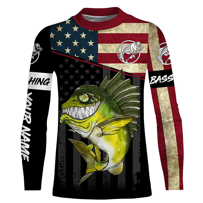 Funny Bass fishing American flag UV protection Custom long sleeve fishing shirt, Bass fishing jerseys NQS4383