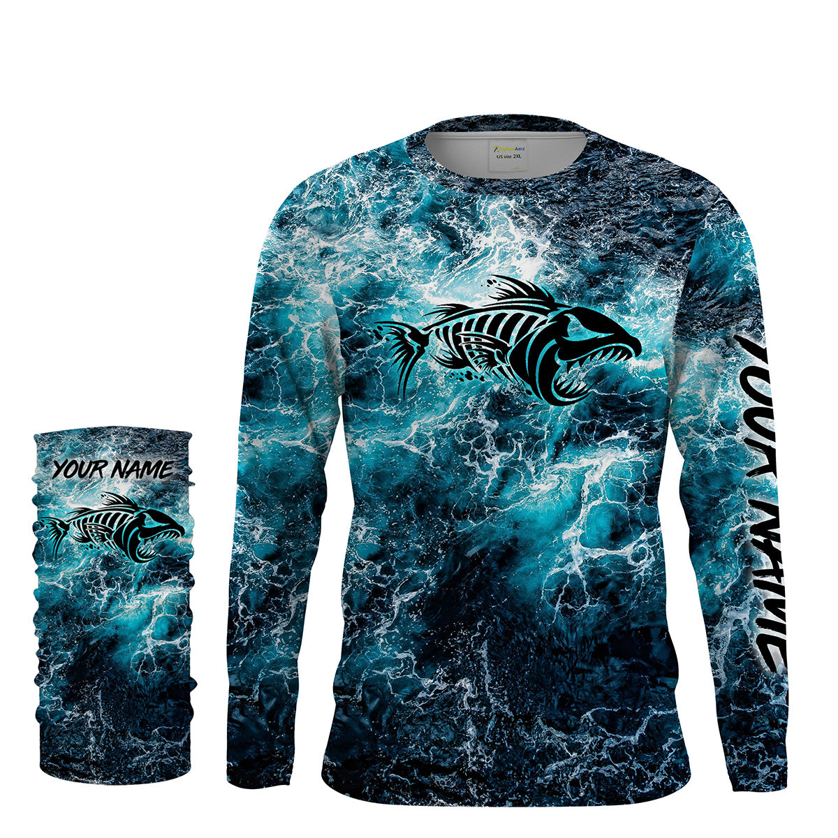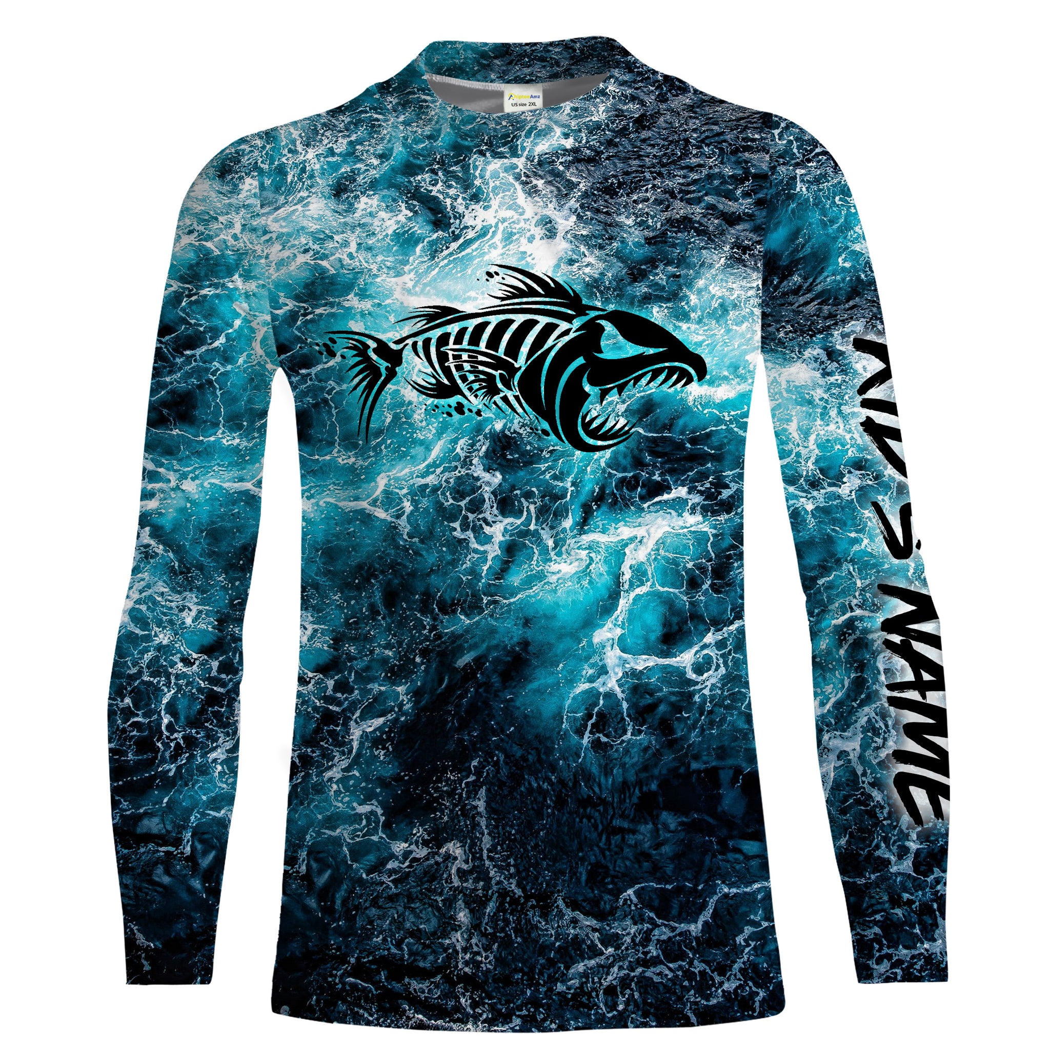 Custom blue ocean fish bone Saltwater Long sleeve Fishing Shirts UV Protection, Sea wave camo Fishing Shirts - NQS2068