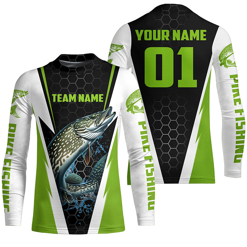 Pike Fishing Long Sleeve Tournament Shirts For Fishing Team With Custom Name And Number | Green IPHW6239