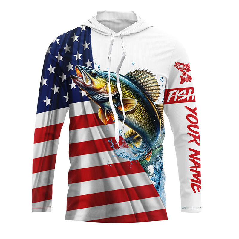 American flag patriotic Walleye fishing Custom Name UV Protection long sleeve Fishing Shirts for men NQS5370