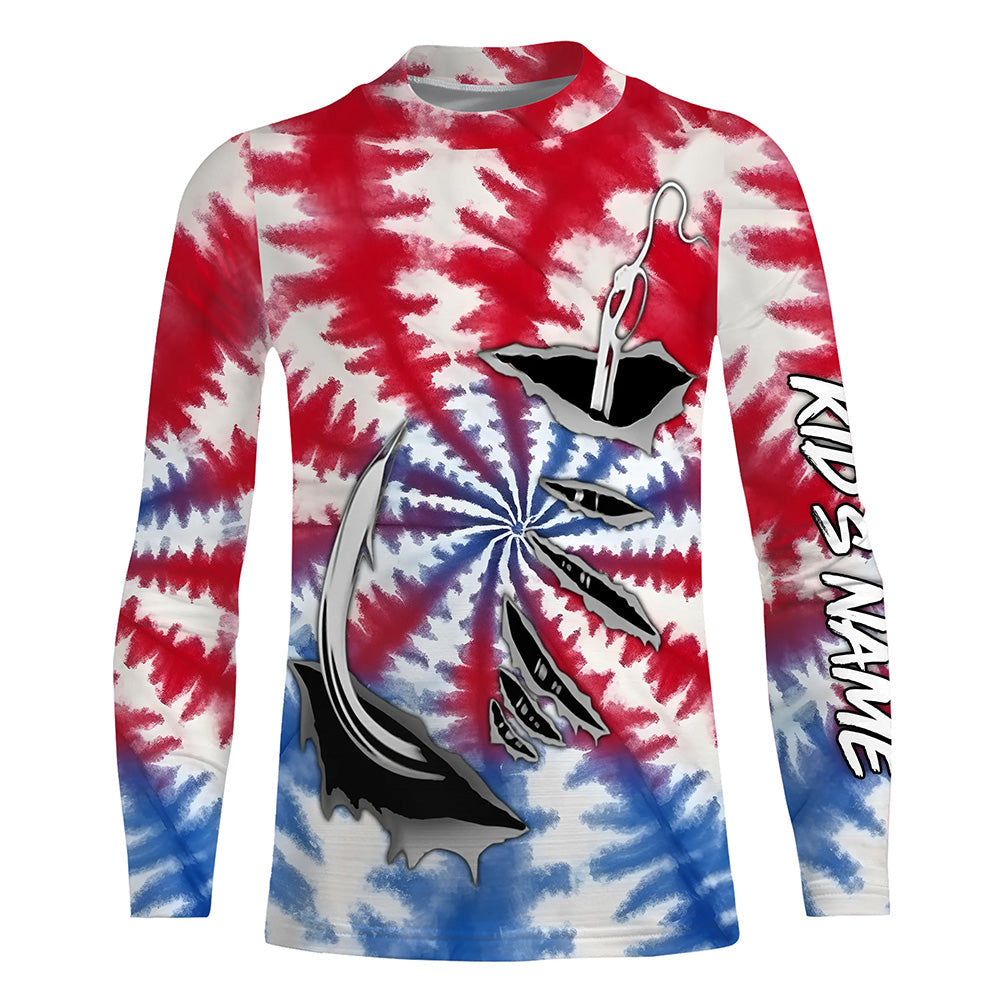 Custom Fish Hook American Flag Tie Dye Camo Long Sleeve Fishing Shirts, Patriotic Fishing Jerseys IPHW4698