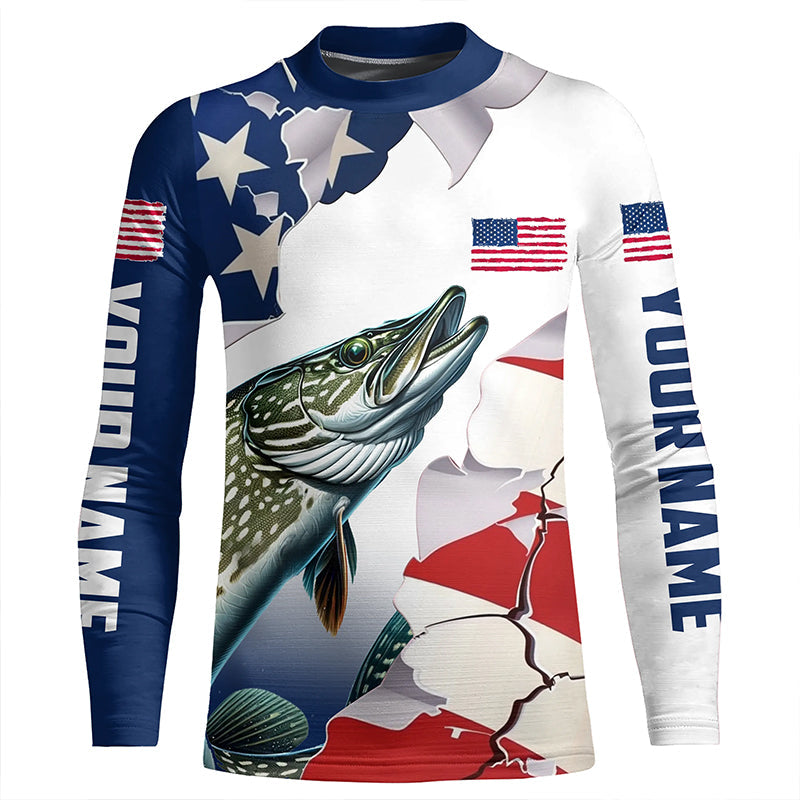 Personalized American Flag Northern Pike Fishing Long Sleeve Shirts, Patriotic Pike Fishing Jerseys IPHW6108