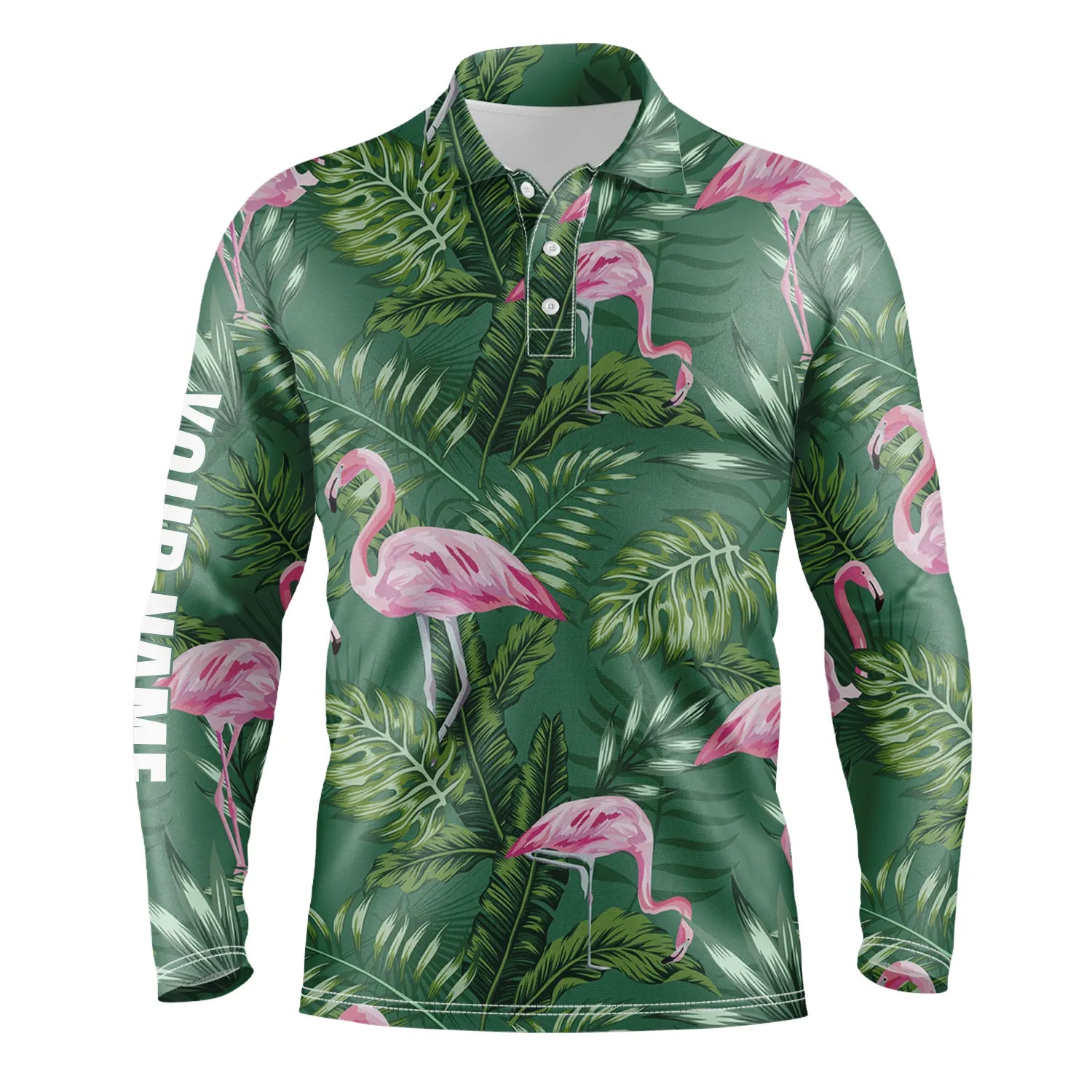 Mens golf polo shirts green tropical plants monstera flamingo golf shirts custom best mens golf wear NQS4842