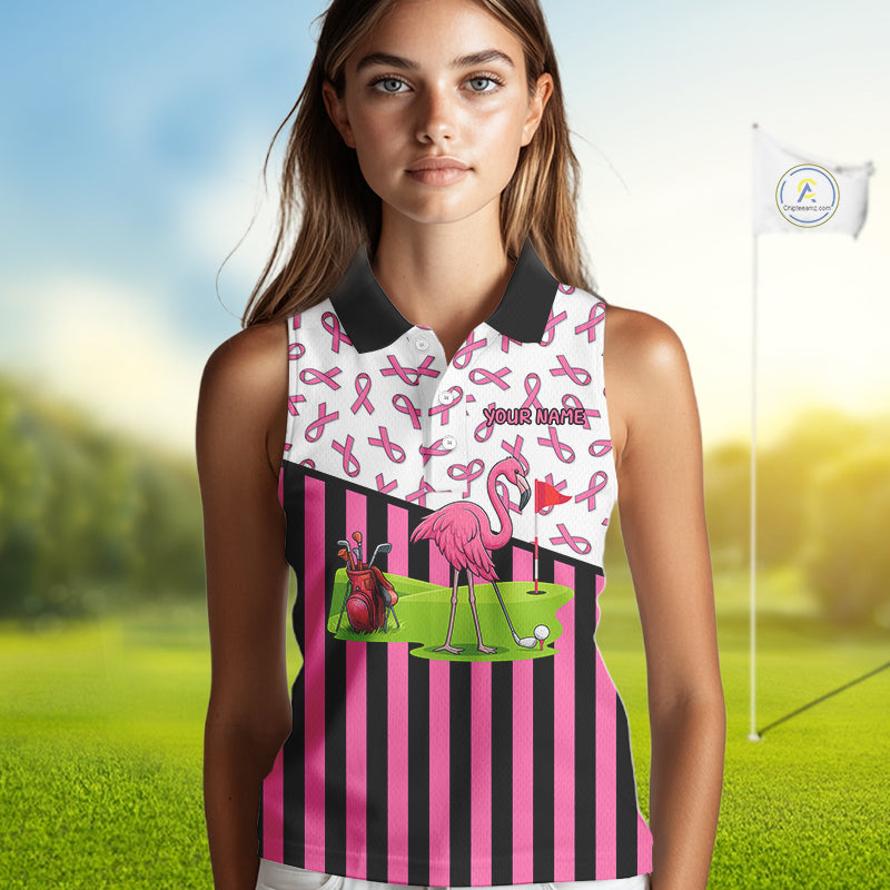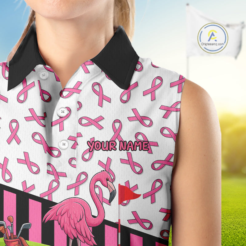 Pink ribbon pattern flamingo Women sleeveless polo shirt Custom breast cancer awareness golf outfit NQS10149