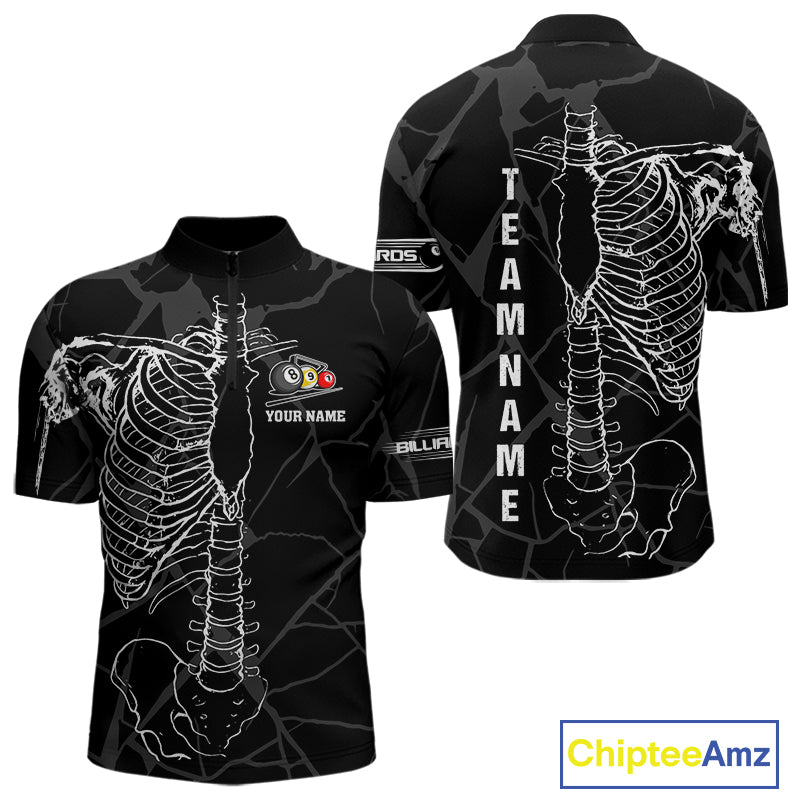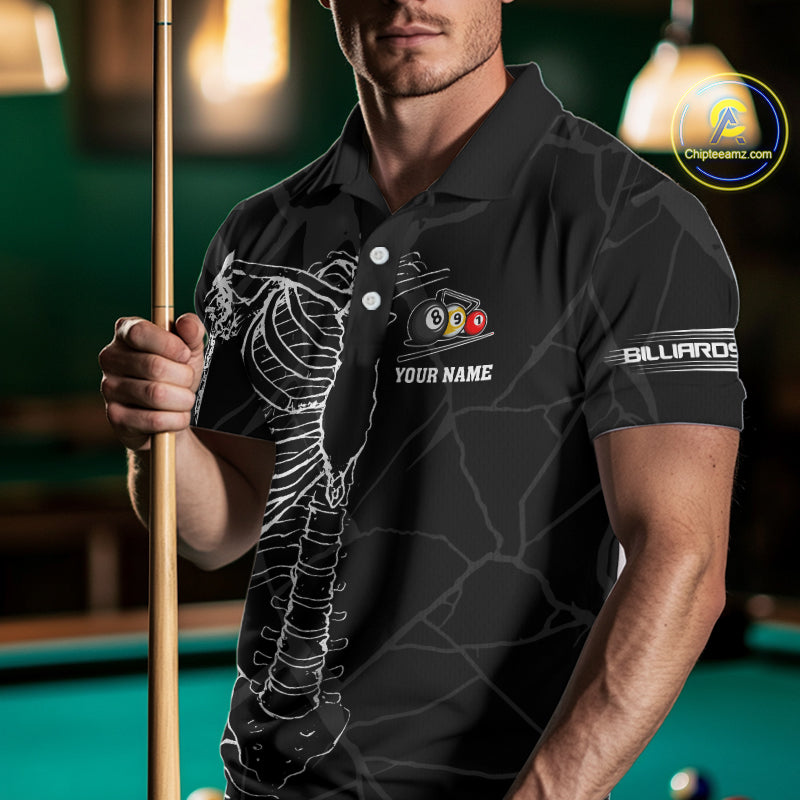 White Skeleton Custom Black Grunge Billiard Shirts For Men, Funny Billiard Jerseys Short Sleeve TDM2723