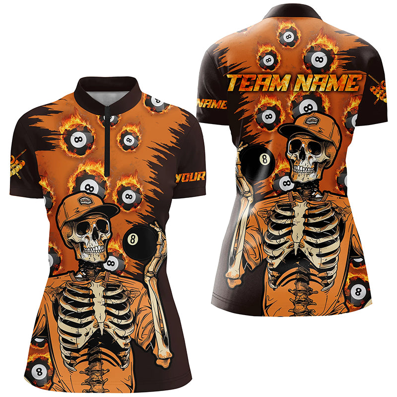 Personalized Orange Funny Skeleton With 8 Ball Pool Women Billiard Shirts, 8 Ball Fire Pool Jerseys TDM1637