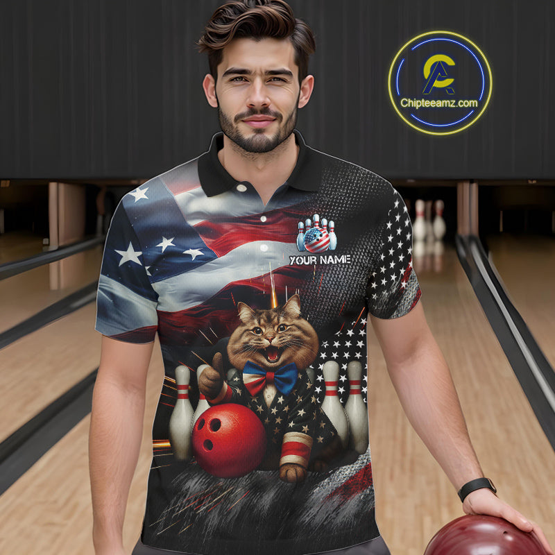 American Flag Funny Cat Bowling Shirt for Men Custom Bowling League Jersey Polo & 1/4 Zip Shirt QZT807