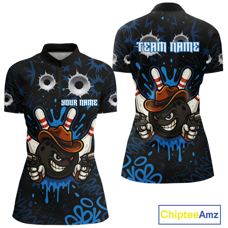 Funny Black and Blue Bowling Cowboy gun Women bowling polo, 1/4 zip shirts Custom bowling team jersey NQS10617