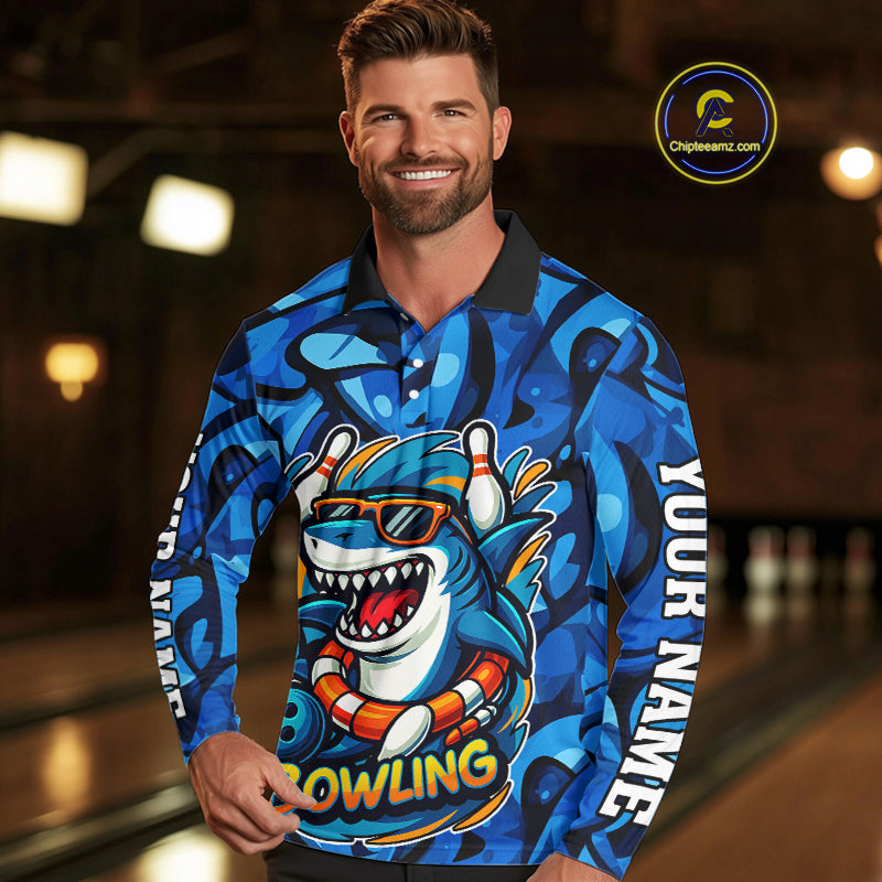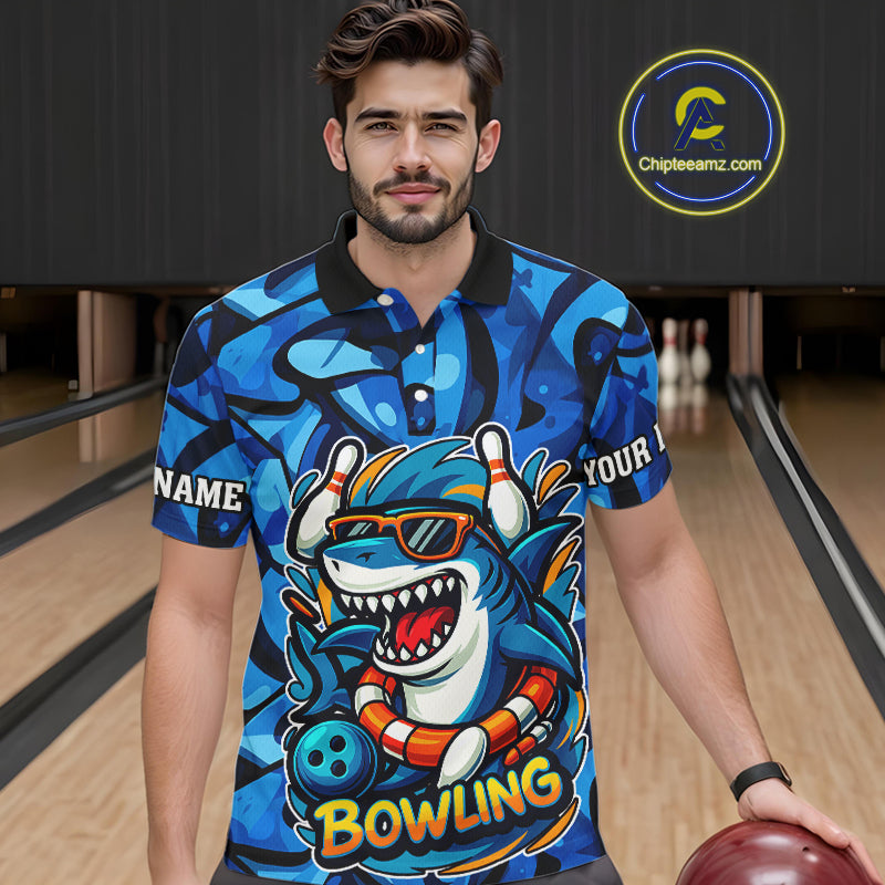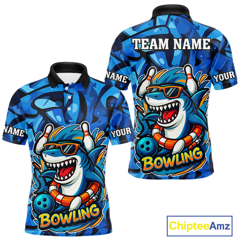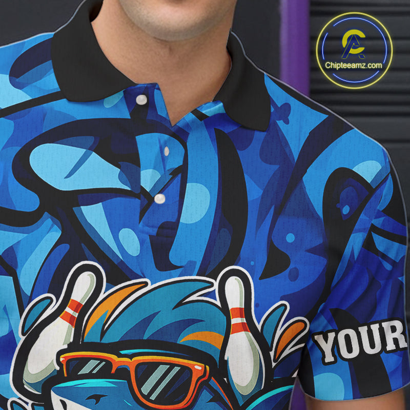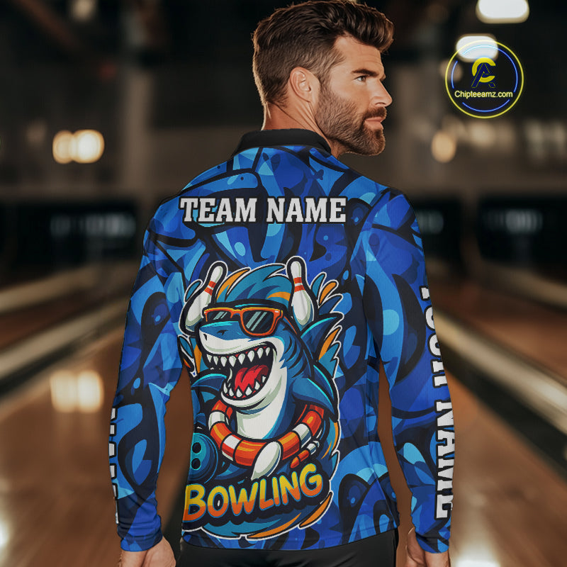 Funny Blue Camo Shark Men Bowling Polo, Quarter Zip Shirts Custom Team Shark Bowling Outfit Jersey NQS9816