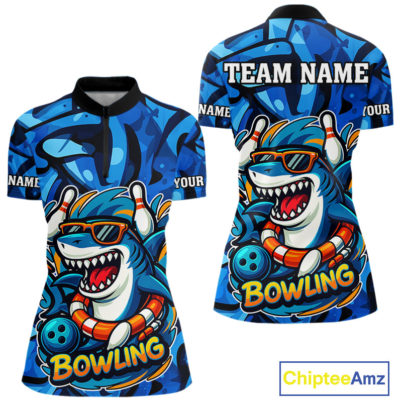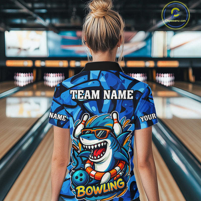 Funny Blue Camo Shark Women Bowling Polo, Quarter Zip Shirts Custom Team Shark Bowling Outfit Jersey NQS9816
