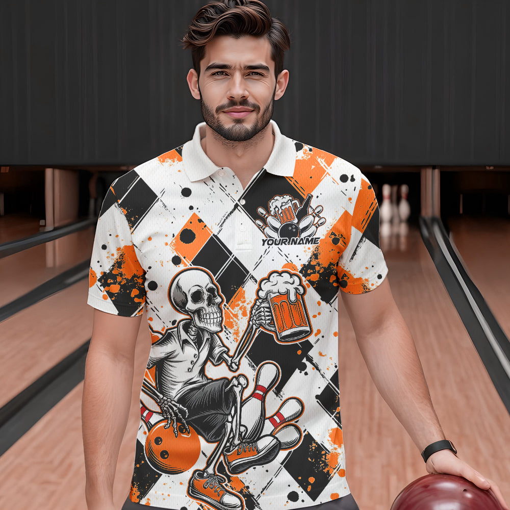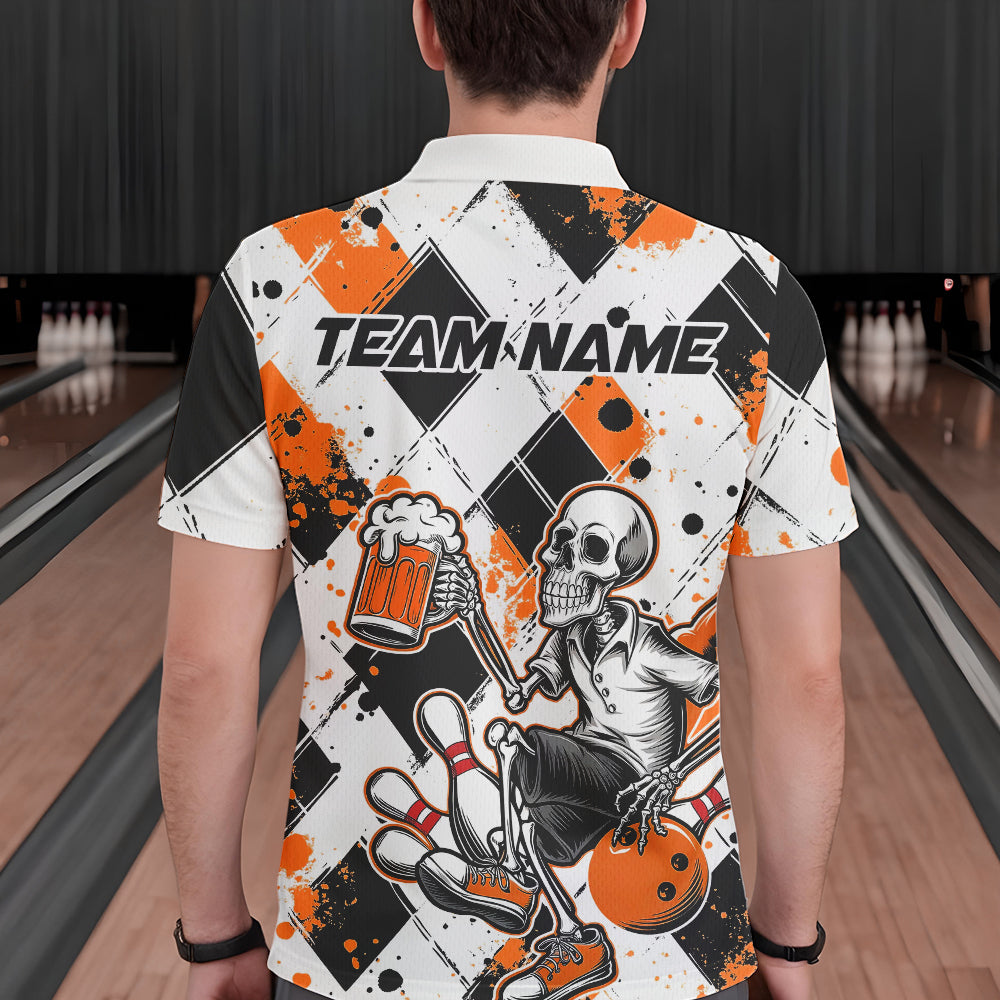Custom Orange Argyle Pattern Funny Skeleton Bowling And Beer Men Polo Shirts, Team Outfit IPHW8893