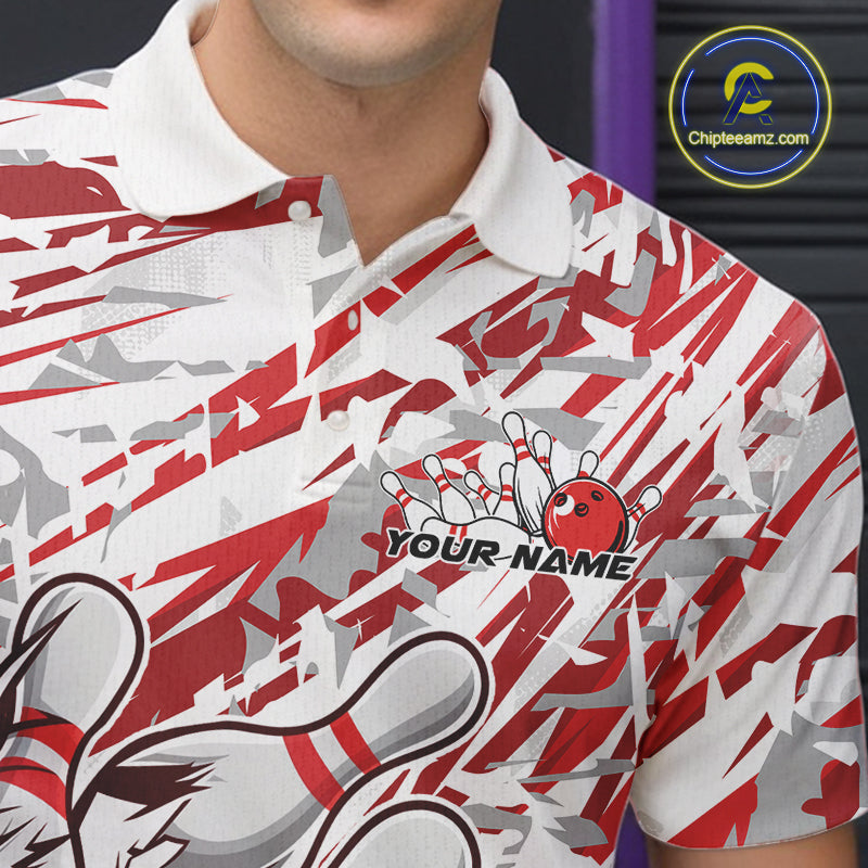 Red Camo Custom Funny Bowling Polo Shirts For Men, Bowling Team Tournament Shirt IPHW9397