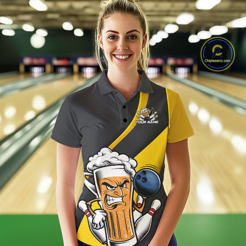 Custom Grunge Yellow Funny Bowling And Beer Polo Shirts For Women, Bowling Team Uniform IPHW9608