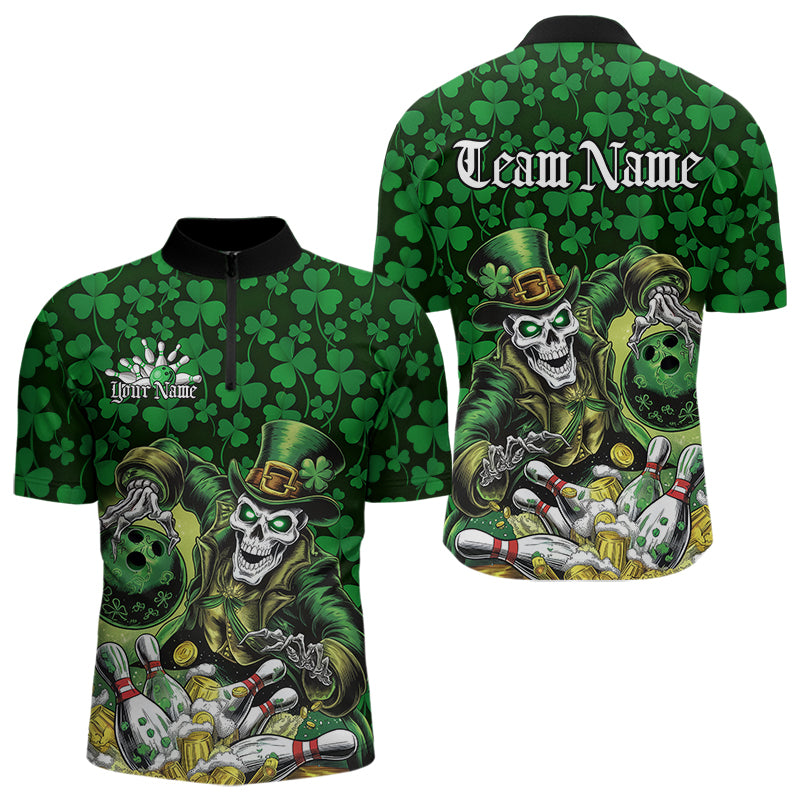 Custom Funny Saint Patricks Day Skull And Beer Bowling Quarter-Zip Shirt For Men, Lucky Team Shirt IPHW8607