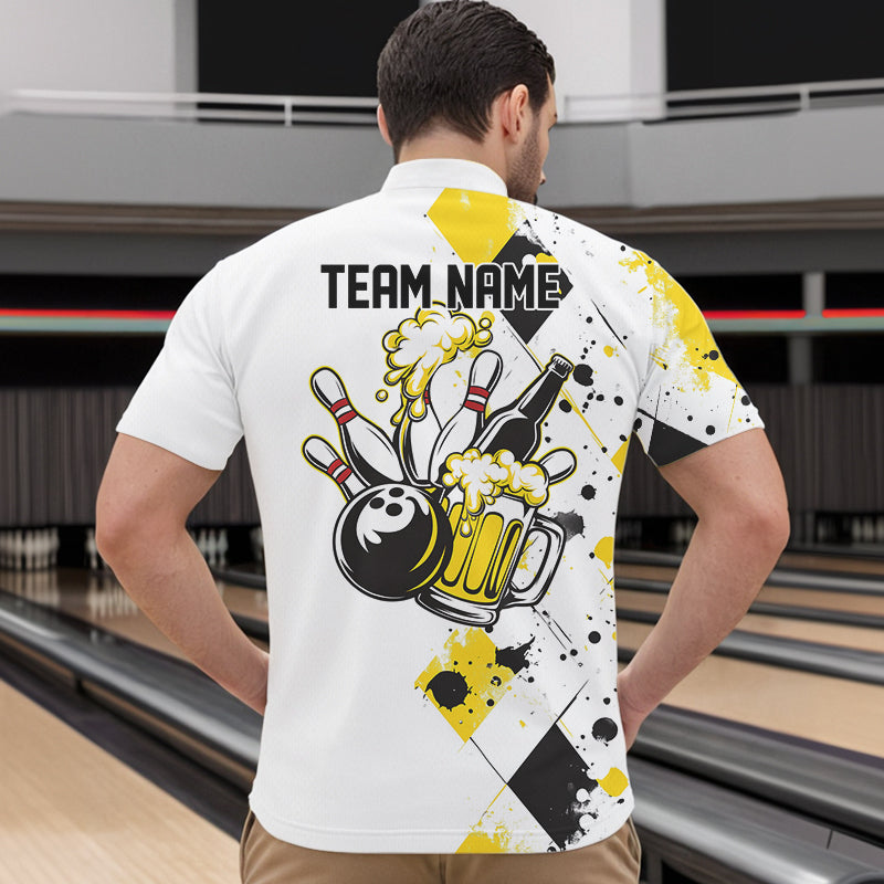 Yellow Argyle Pattern Custom Funny Bowling And Beer Team Quarter-Zip Shirts For Men IPHW8889