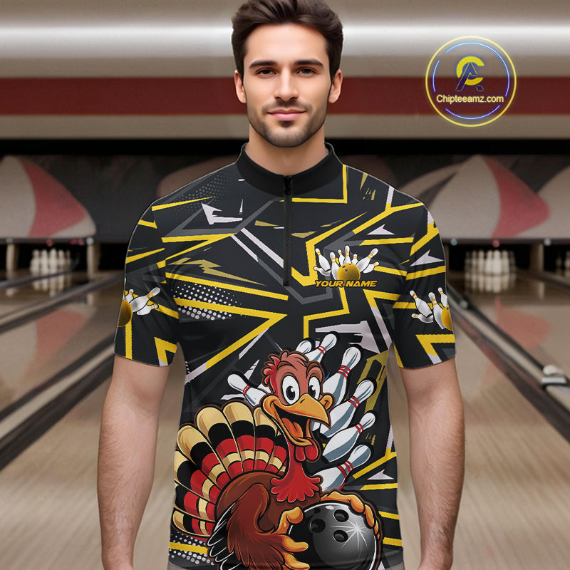 Custom Funny Turkey Bowling Jerseys, Yellow Thanksgiving Bowling Team Men Quarter-Zip Shirt IPHW9722