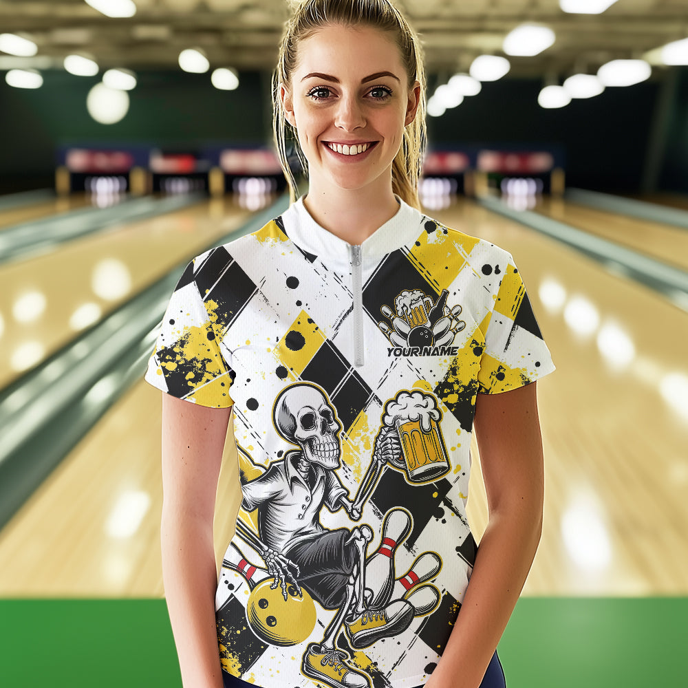 Custom Yellow Argyle Pattern Funny Skeleton Bowling And Beer Women Quarter-Zip Shirts IPHW8892