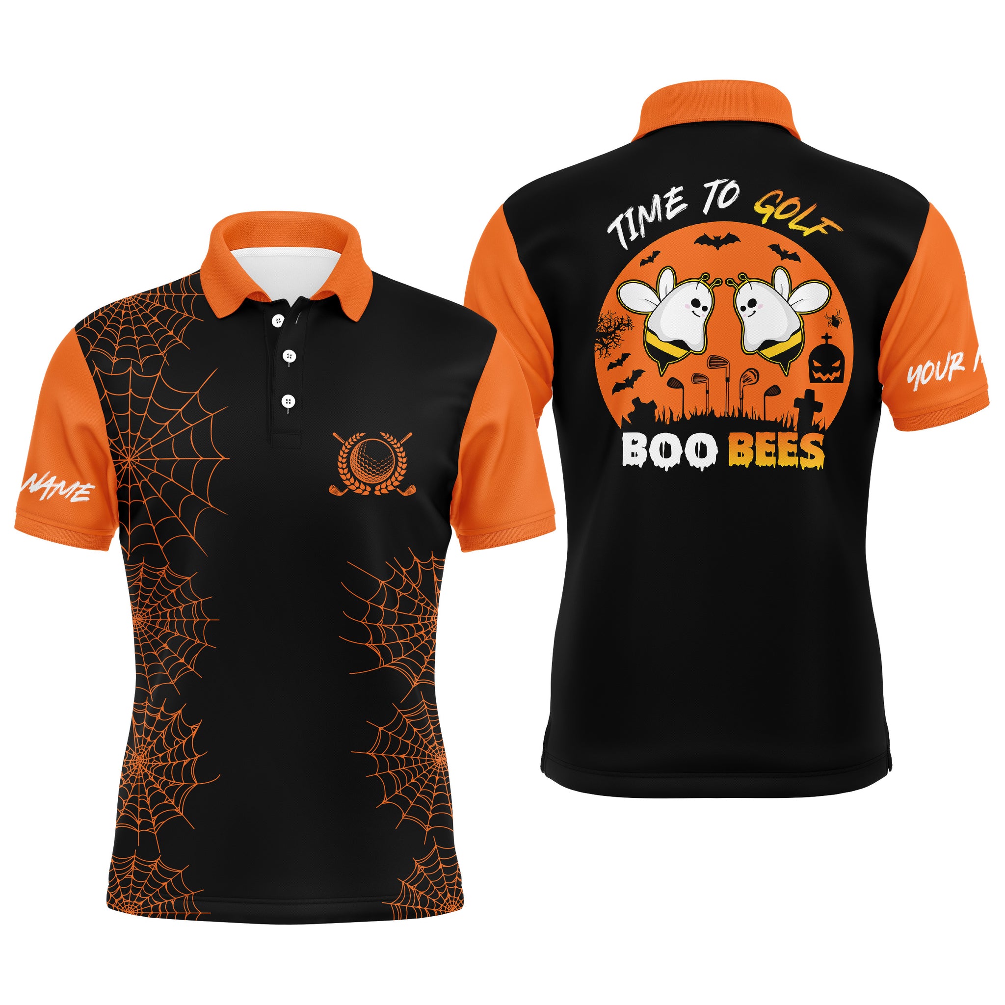 Funny black orange Halloween golf shirt custom name mens golf polo shirt - Time to golf boo bees NQS4028
